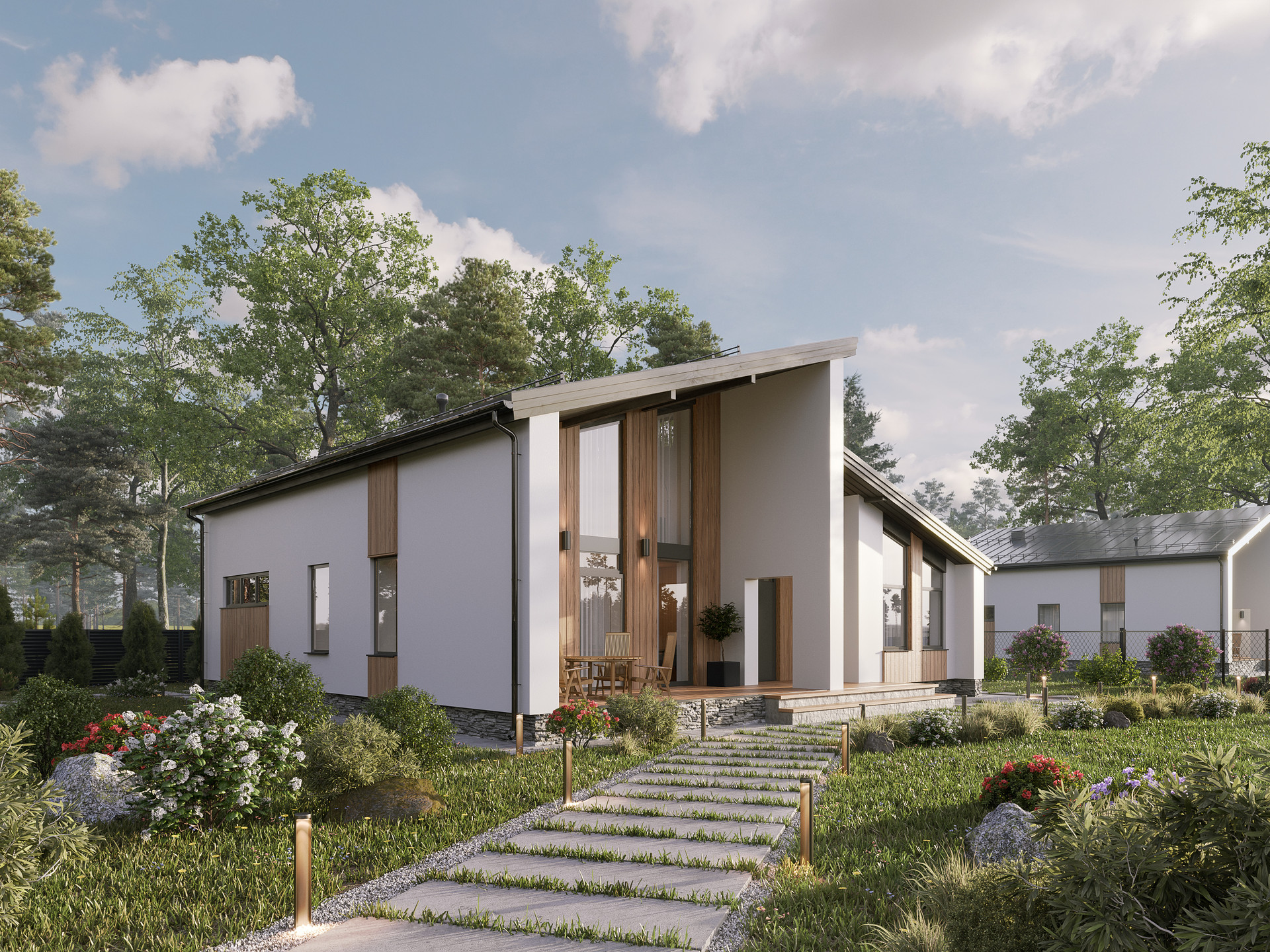 Кровля двускатная, утеплённая, вентилируемая, с разновысокими скатами. Подшивка карнизных свесов.