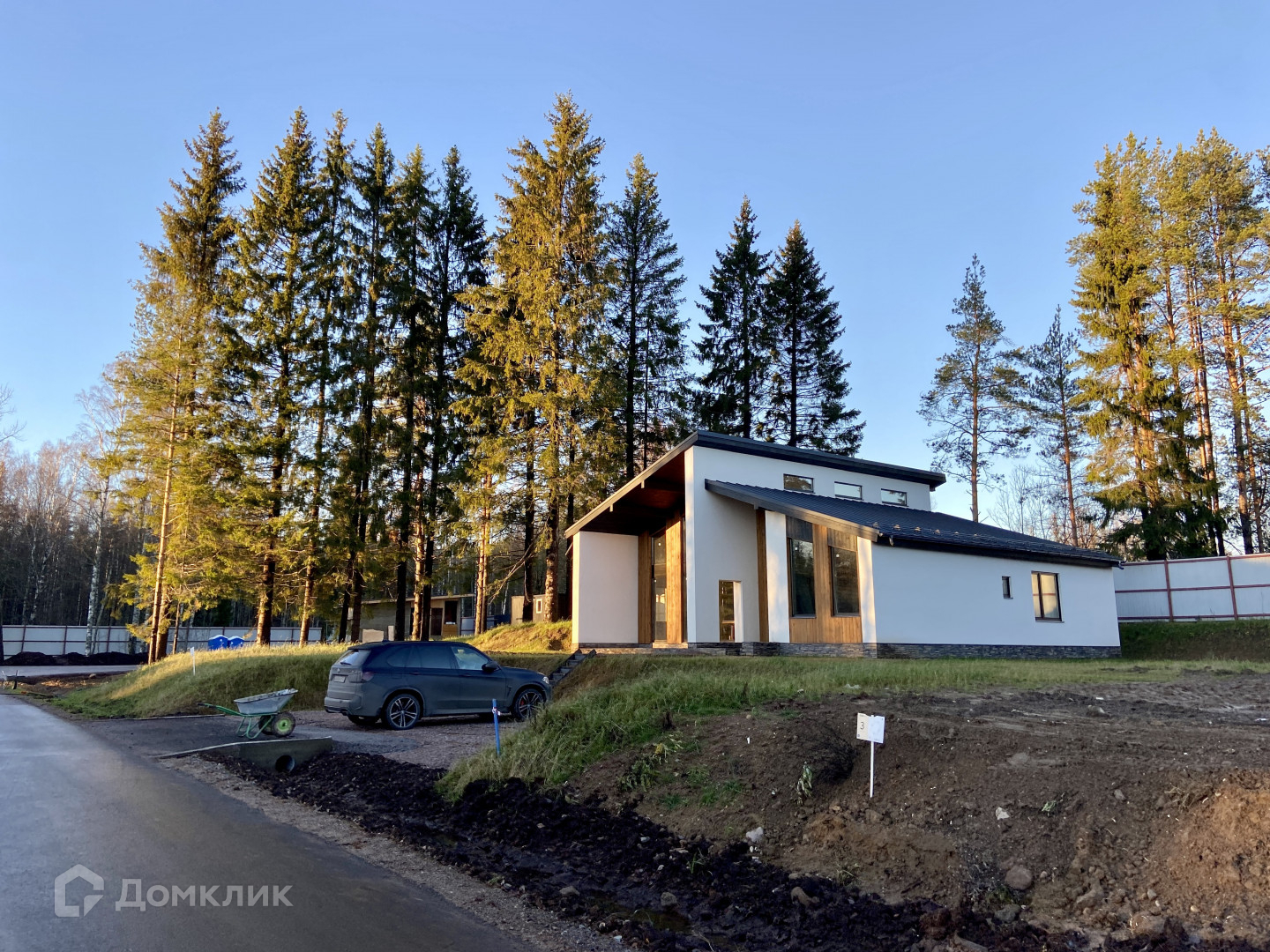 Дом с полностью готовой отделкой фасада, эл-во заведено внутрь, сделана парковка под авто, внутри отштукатурен.
