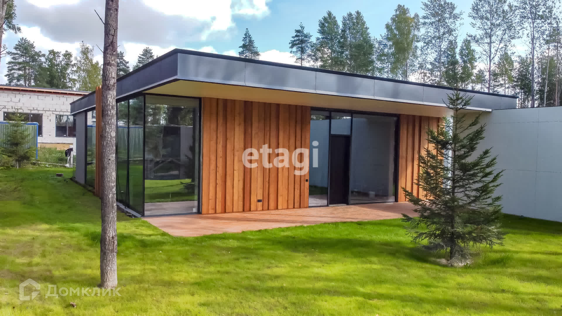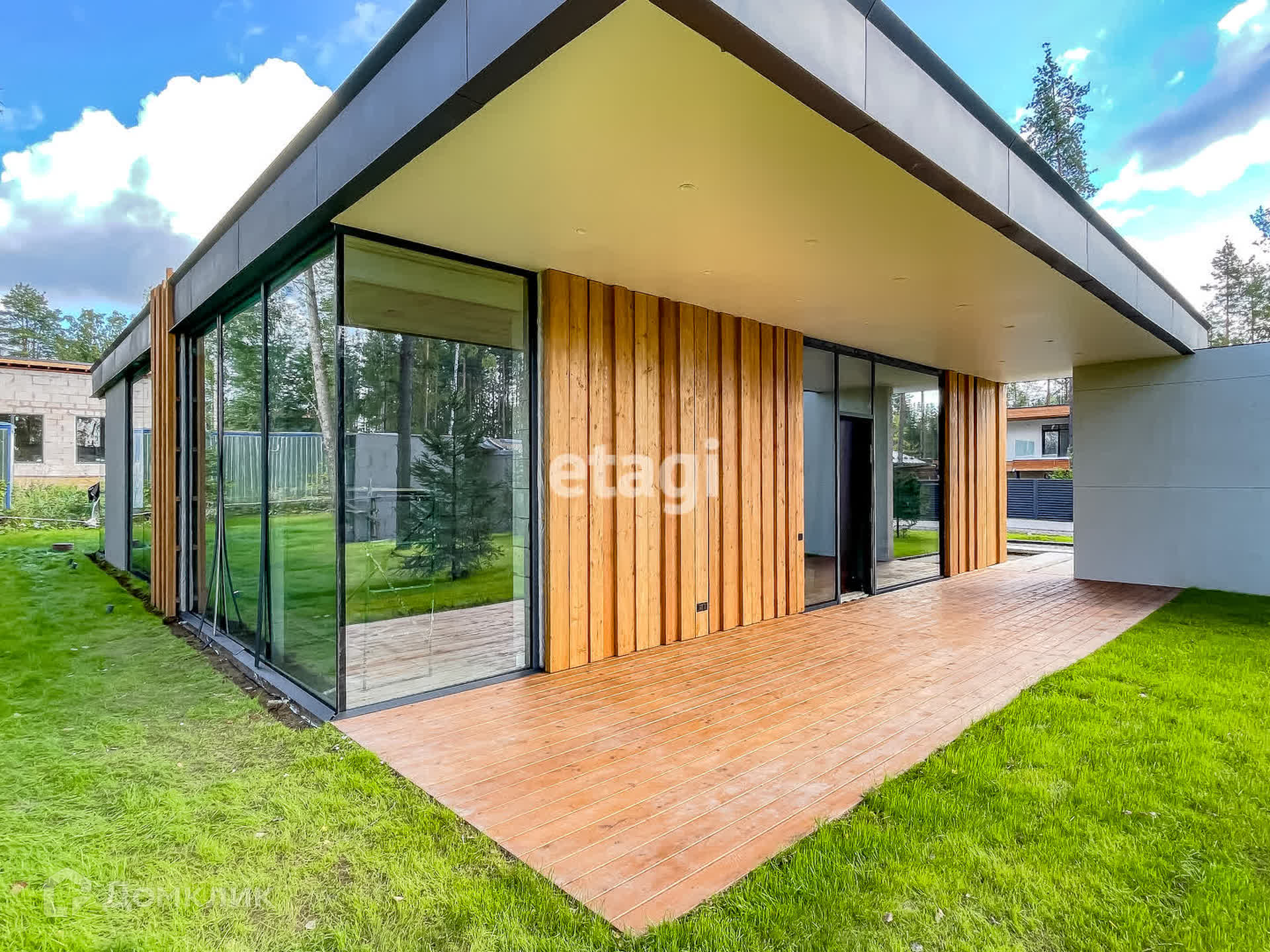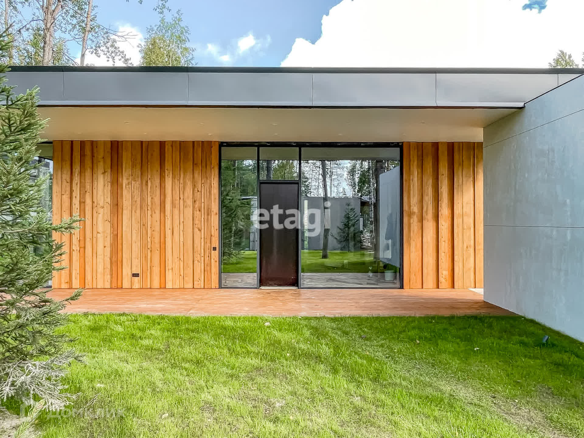 В кухне-гостиной большая площадь остекления «в пол», что создает ощущение огромного светлого пространства, с возможностью любоваться красивым участком и закатами. Остекление дома – панорамные окна с низкоэмиссионным стеклом, позволяющим эффективно сохранять тепло внутри дома. Терраса правильной формы позволяет расположить и обеденную зону и зону релакса, что безусловно будет являться местом притяжения всей семьи и гостей летом. На террасе и фасадах натуральная доска -лиственница, пропитана террасным маслом, что повышает ее долговечность.