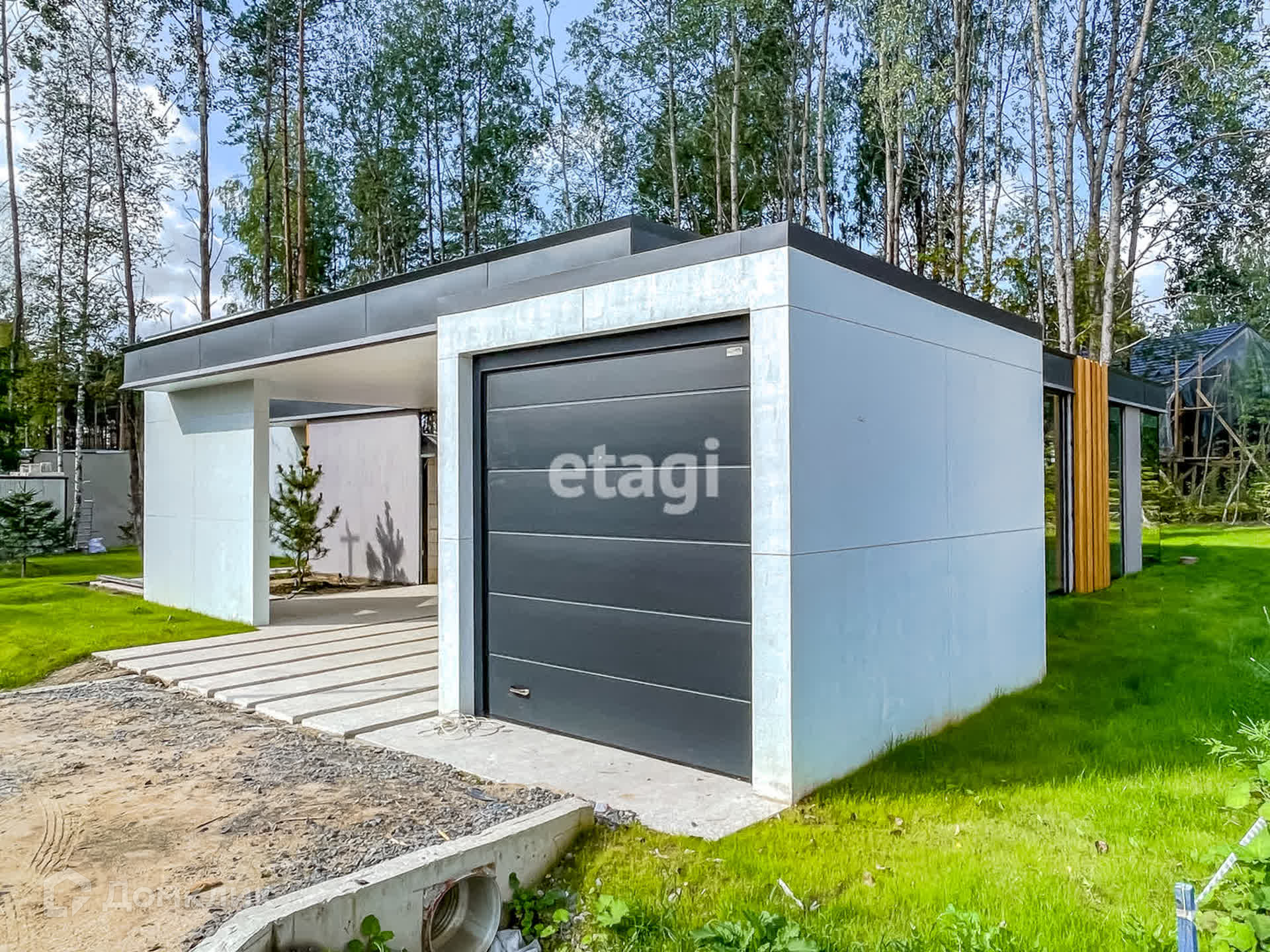 Входная зона - парковка, вмещающая 2 машины, под крышей, выложенная плитами и засыпанная щебнем мелкой фракции. Выполнена подсветка фасада дома и участка. Отдельно стоящий хозяйственный блок, площадью 12 м кв. с подъёмными воротами.