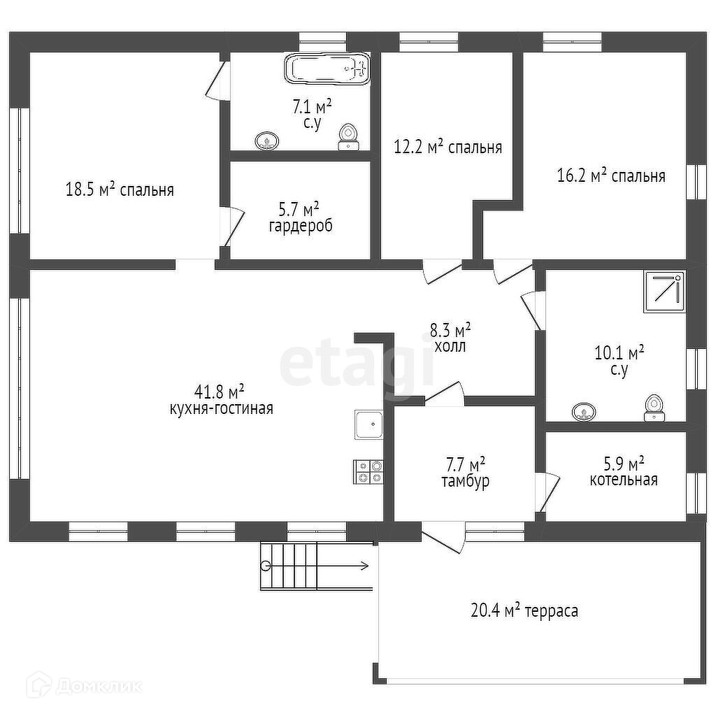 В доме Большая кухня-гостиная 41кв.м., мастер-спальня со своим санузлом и гардеробной, две детские комнаты, котельная, просторная прихожая зона, сан.узел с душевой, терраса 20м2.