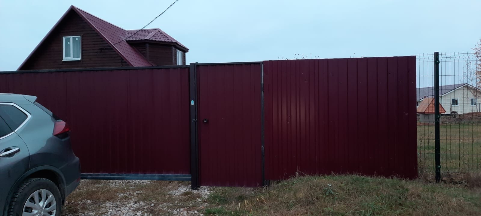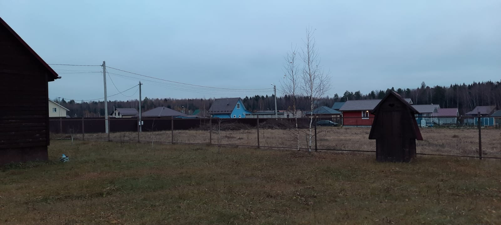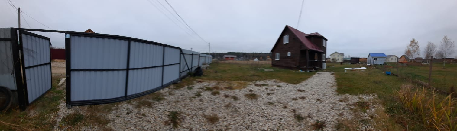 Участок огорожен с трех сторон рабицей, с одной стороны профлистом. На въезде на участок откатные ворота и калитка. Оборудовано место для стоянки 2-х авто и отсыпана гравием дорожка до входа в дом.