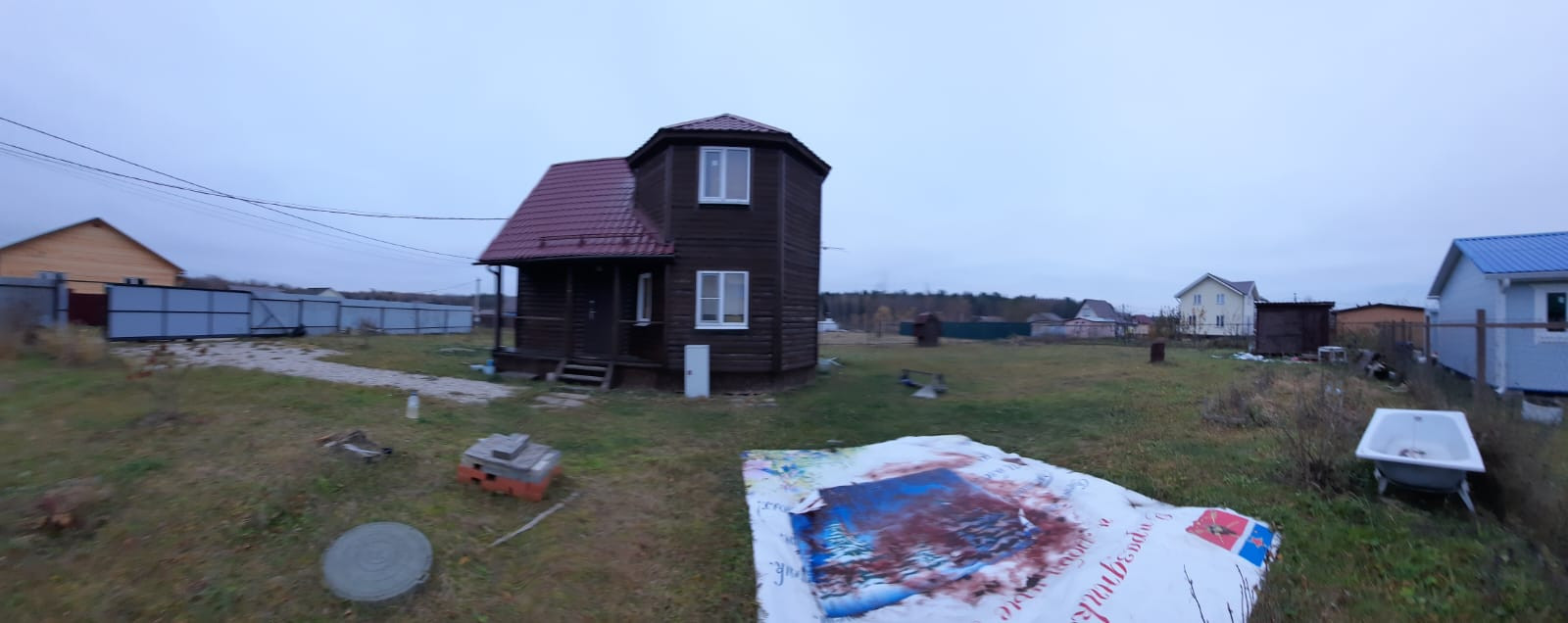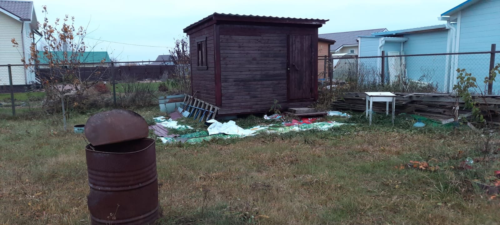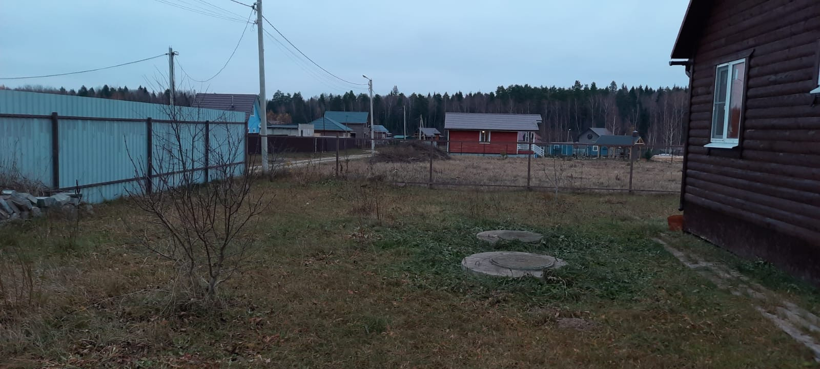 Участок огорожен с трех сторон рабицей, с одной стороны профлистом. На въезде на участок откатные ворота и калитка. Оборудовано место для стоянки 2-х авто и отсыпана гравием дорожка до входа в дом.