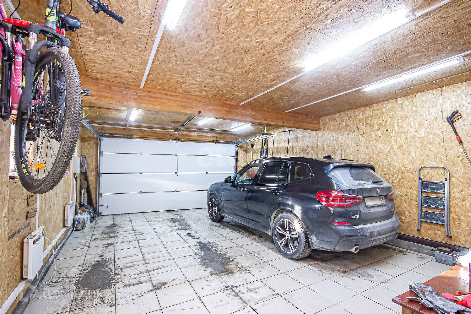 На участке есть баня с купелью и гаражный комплекс, на два автомобиля с гостевой комнатой, на втором этаже.