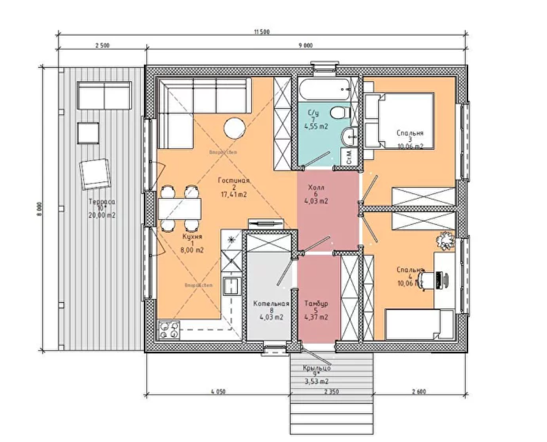 Проект может быть адаптирован под вас. Расположение комнат, стен, технических помещений можно изменить согласно вашему желанию. Это не влияет на стоимость дома.