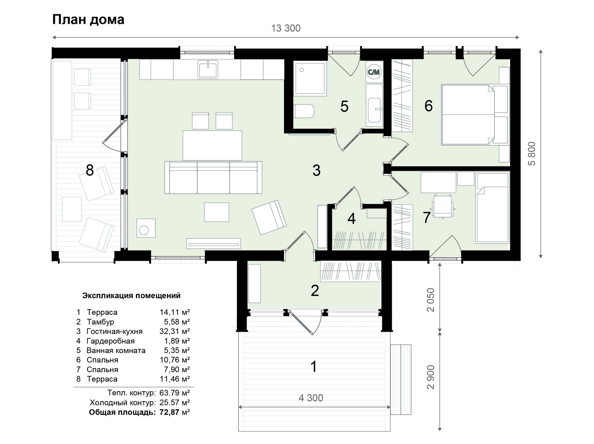 Отделка фасада скандинавской тонкопилёной доской, окрашенной в заводских условиях. Окна Rehau Grazia 70-5 с энергосберегающими стеклопакетами.