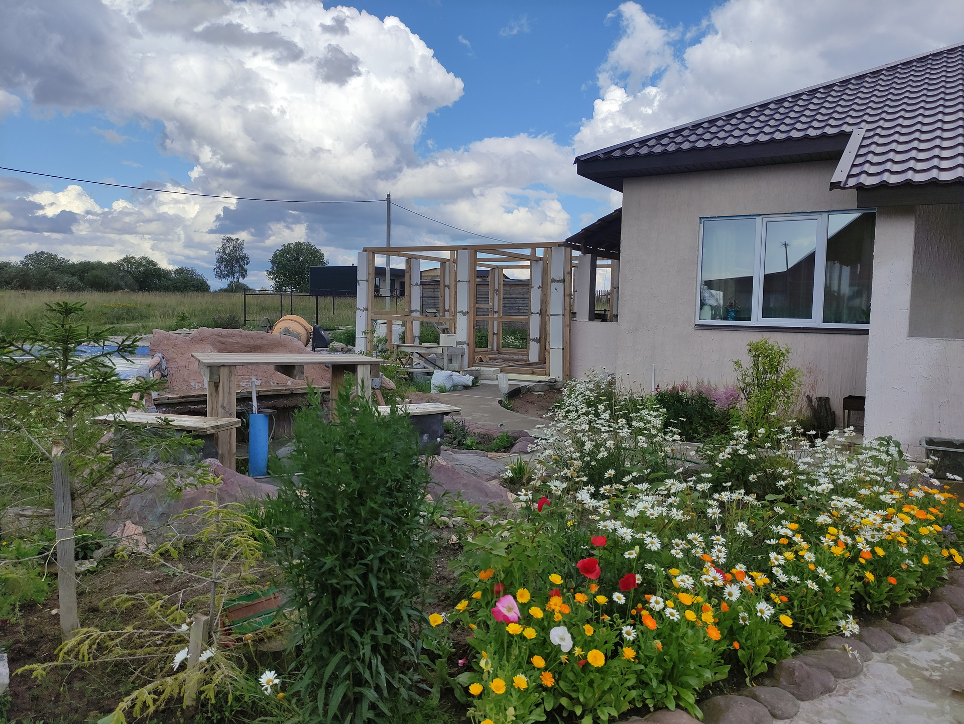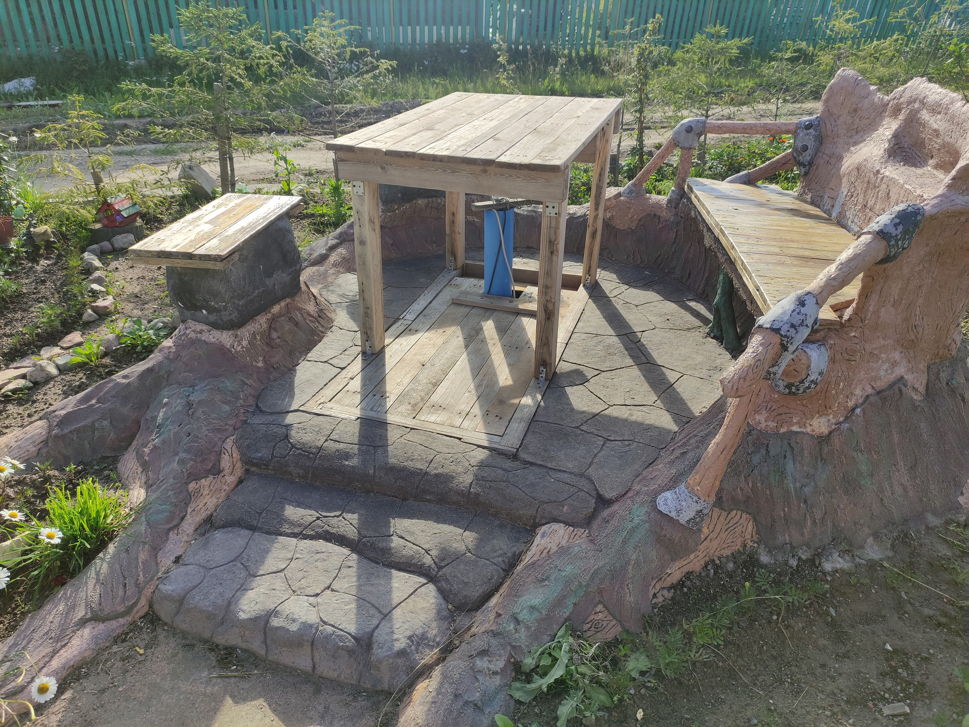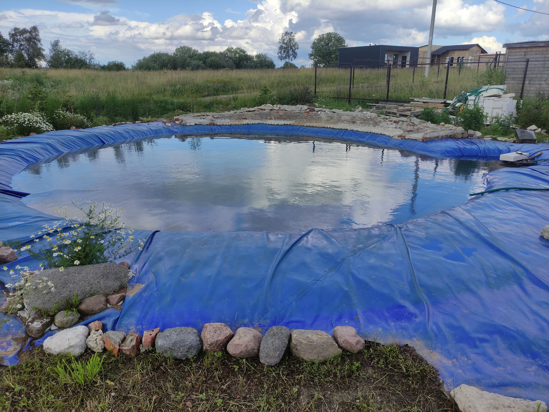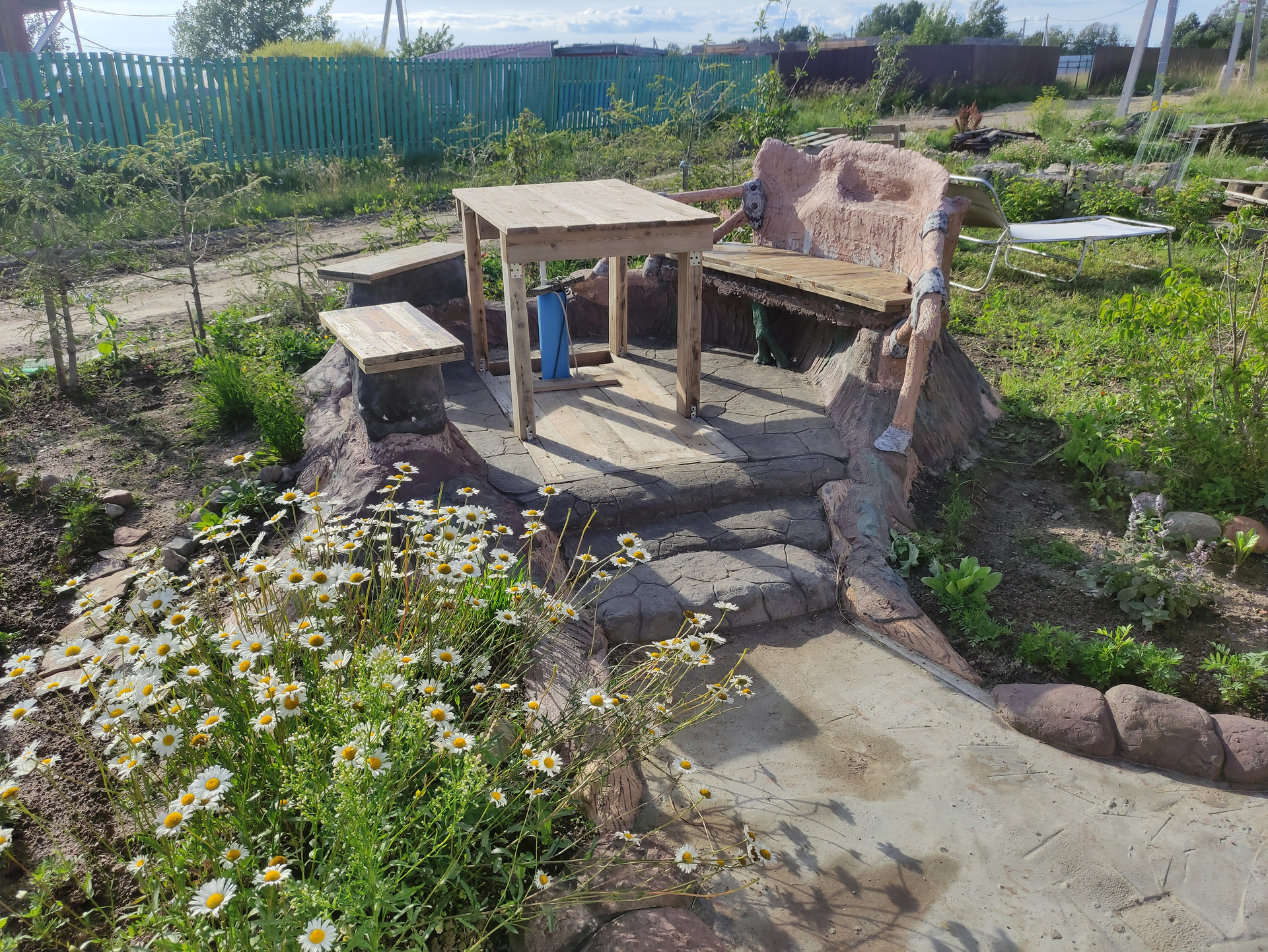 Половина участка облагорожена (ландшафтный дизайн + арт-бетон), половина в процессе. На участке имеется водоем диаметром 14 метров с начатым возведением фонтана (отдельно можно обсудить подряд на доведение всех начинаний до ума: бассейн, фонтан + ручьи, площадка для барбекю и дорожки, достройка пристройки, остальное оформление участка)