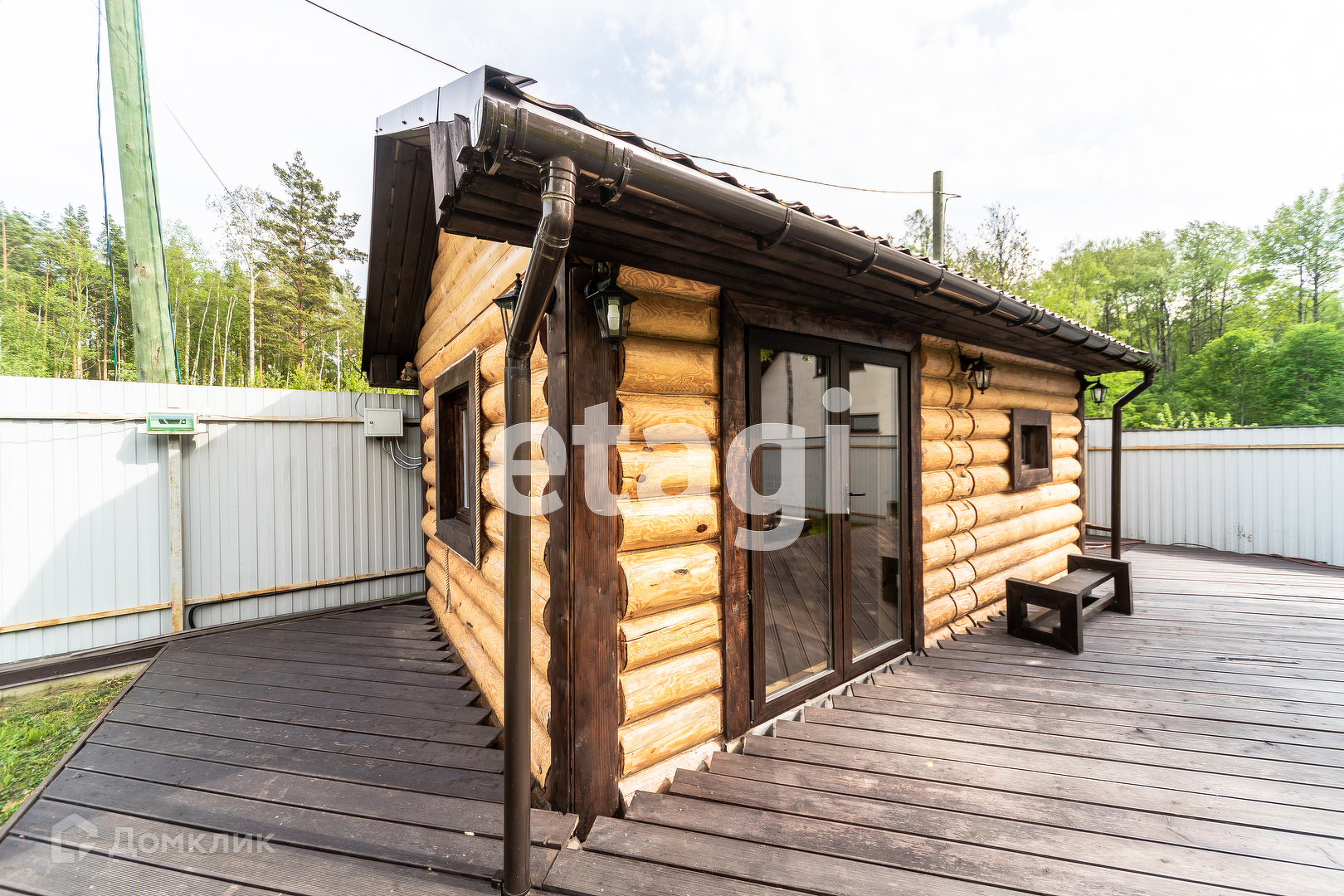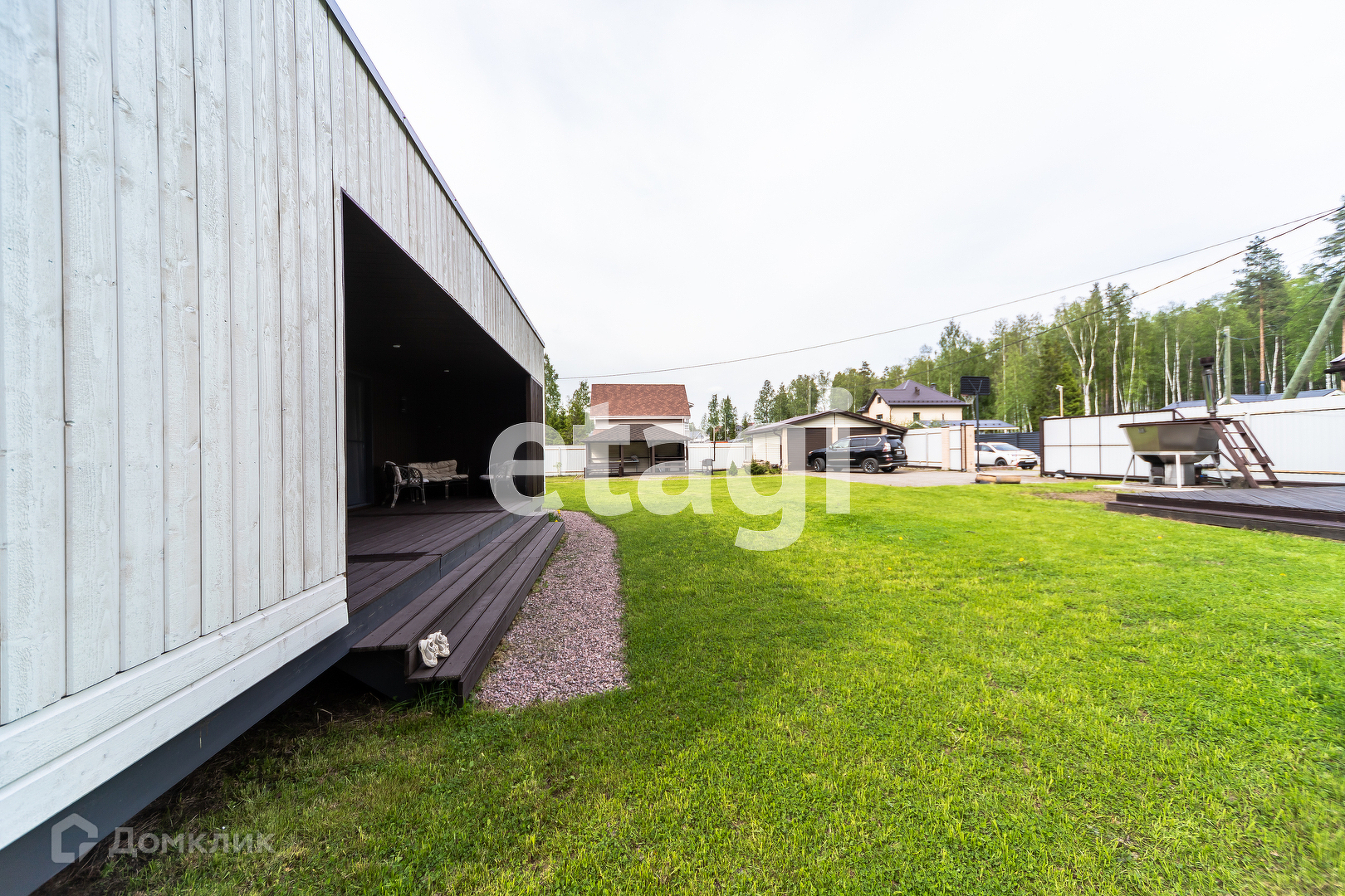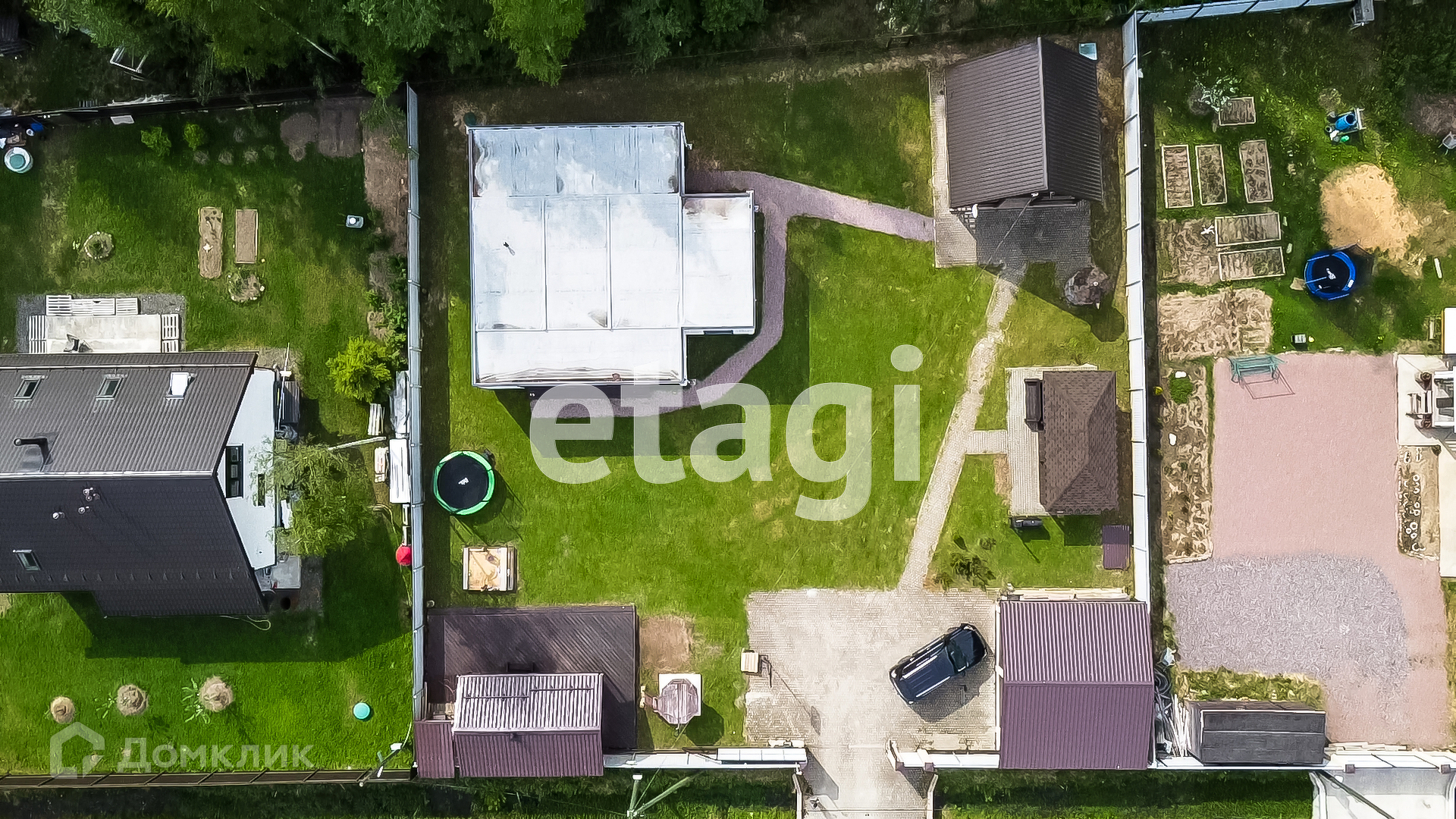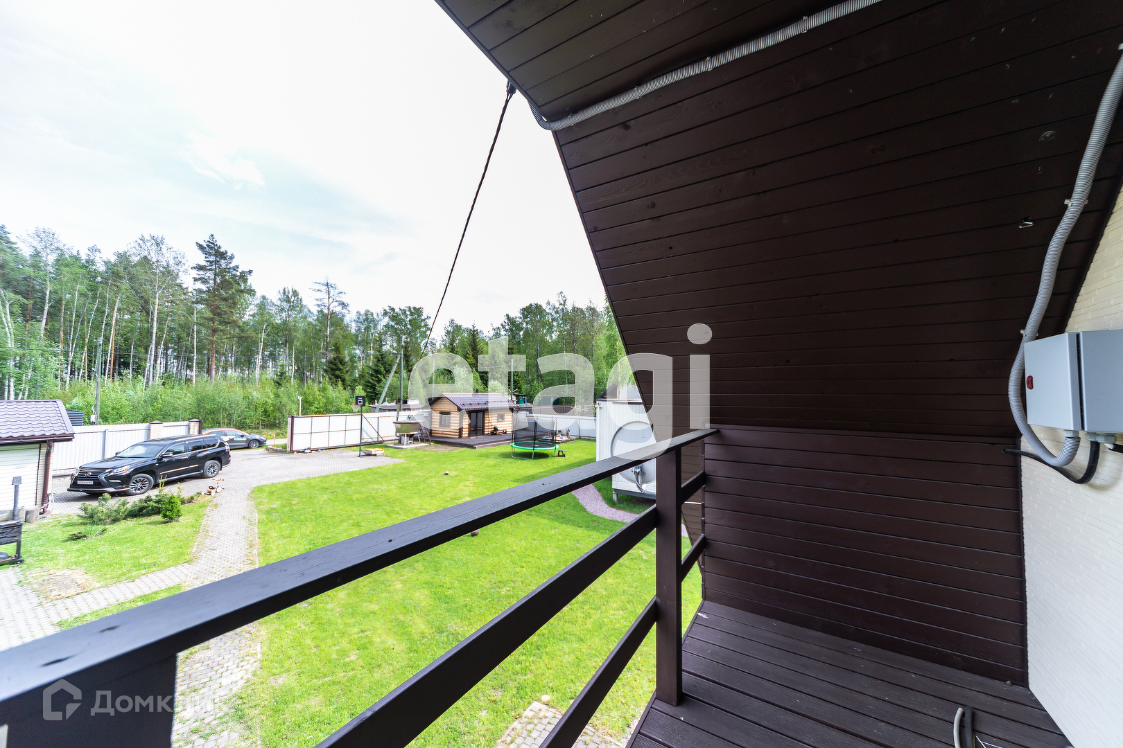 Участок площадью 12 соток с двумя жилыми домами (основной и гостевой), баней из натурального кругляка, гриль зоной и гаражом с откатными электрическими воротами.