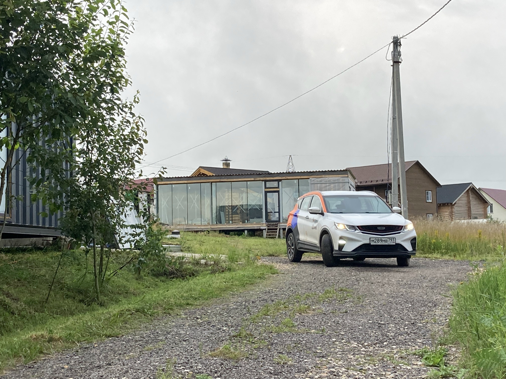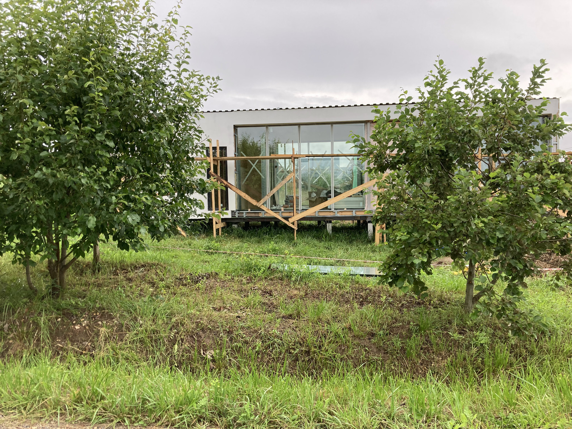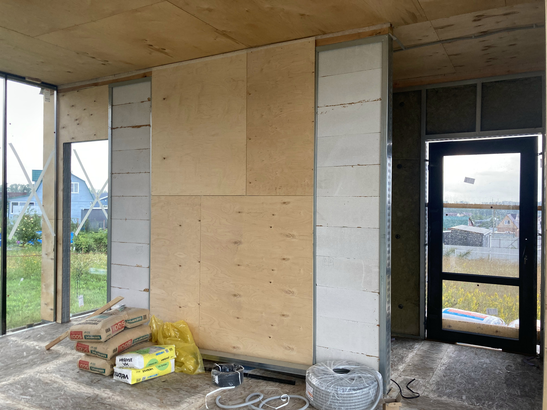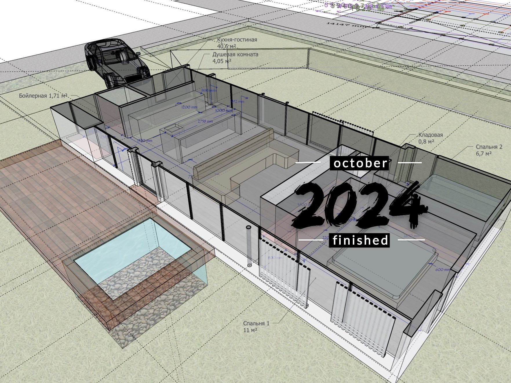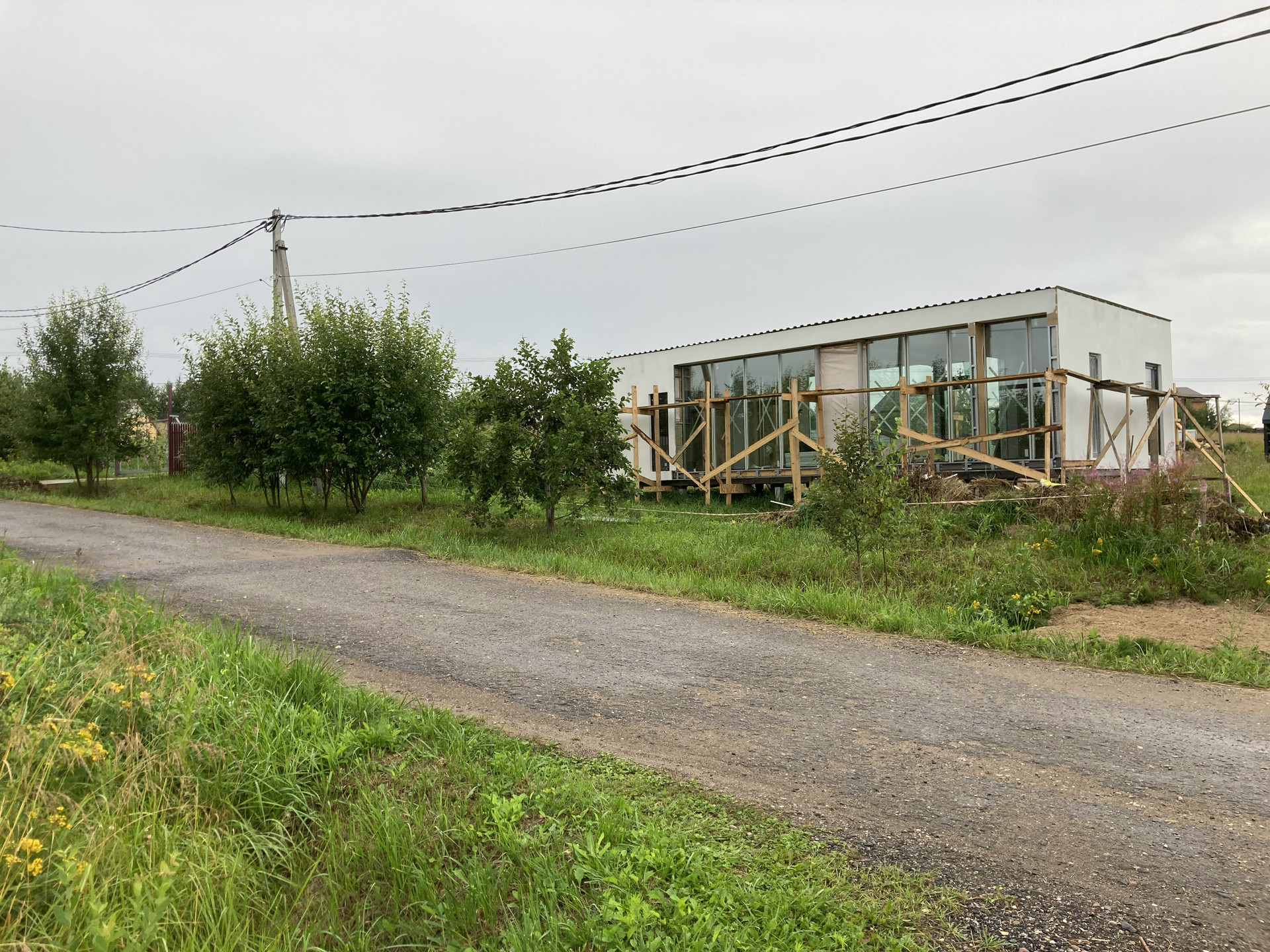 Дом уже поставлен на учёт, получена Выписка ЕГРН, коммуникации заведены в дом, уличные террасы смонтированы.
