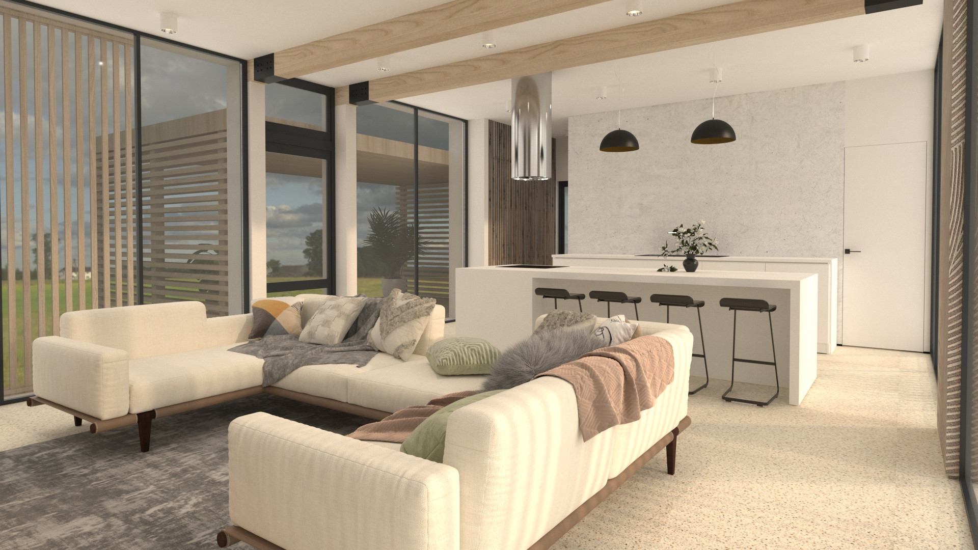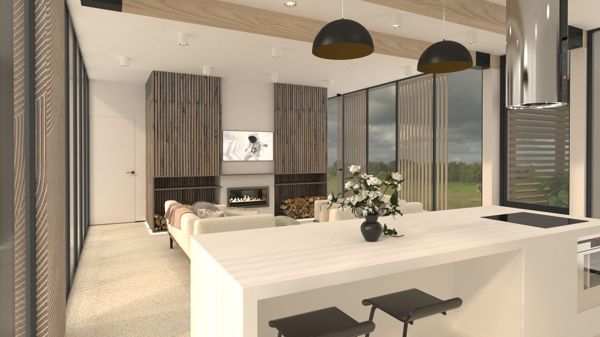 Было принято преднамеренное решение использовать минималистичные материалы интерьера, чтобы не отвлекать внимание от видов через открытый застекленный безрамный фасад.