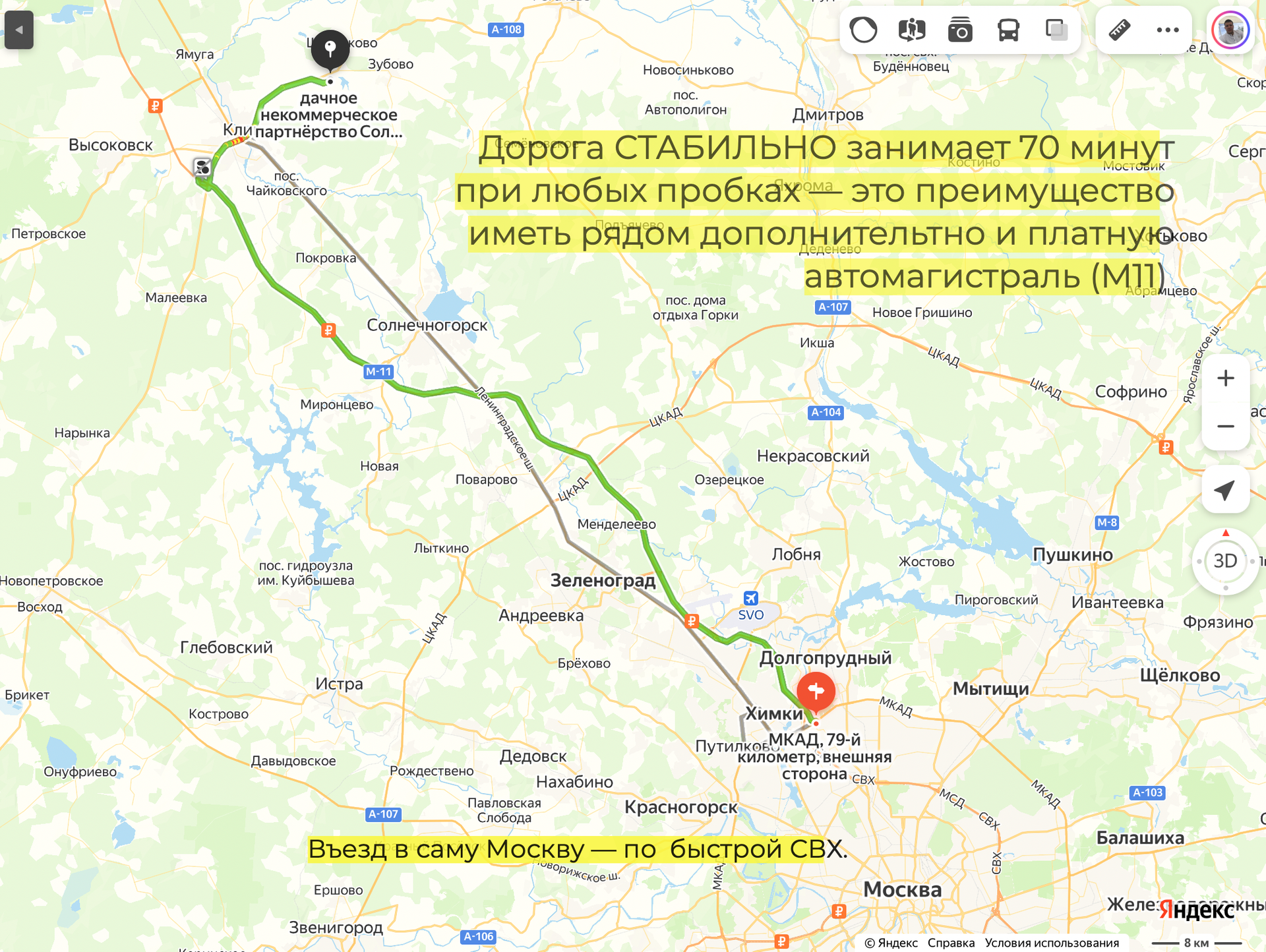 • Наличие "второй дороги". Выход на альтернативную ,всегда беспробковую, автодорогу - скоростную и платную автомагистраль ️ М11 с заходом в саму Москву по быстрой СВХ.