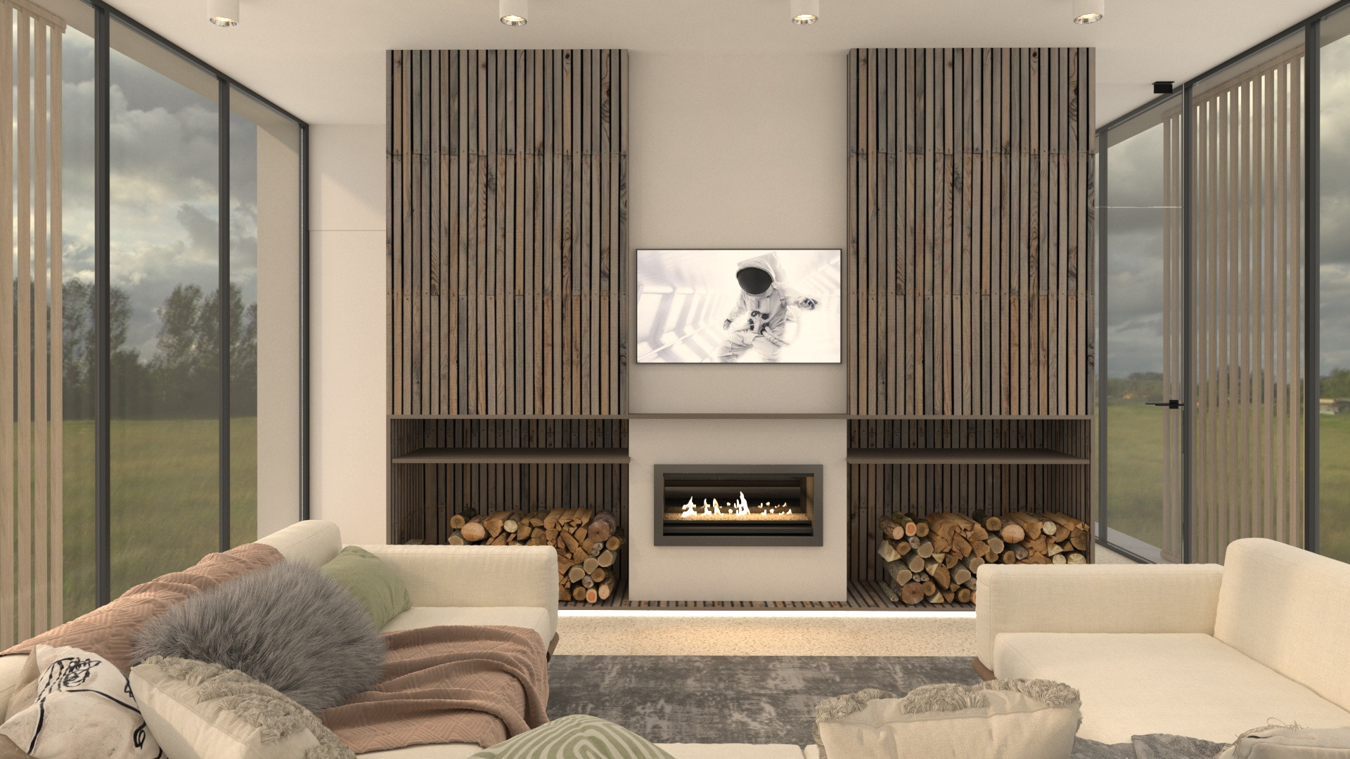 * lounge-зона с камином ;
