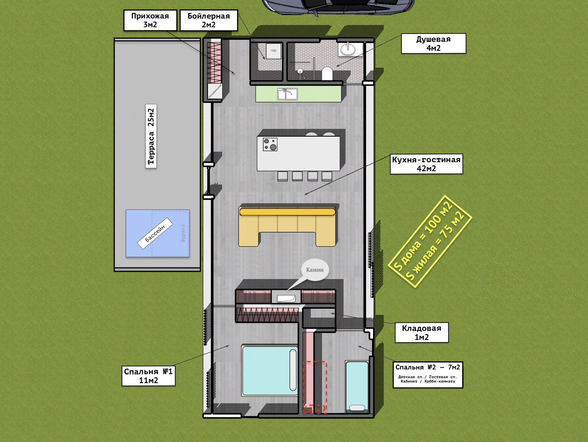 Дома площадью 100 м² (75м2 жилая площадь + 15 м2 терраса) с обширным участком 14 соток – это непревзойденное сочетание современных решений и уютной загородной атмосферы.