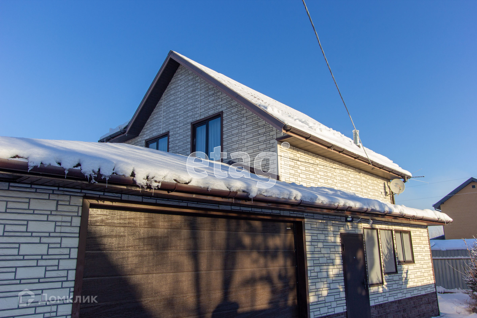 В доме газовое отопление, центральный водопровод, на первом этаже большая гостиная с камином и выходом в сад, прихожая, кухня, туалет. На втором этаже большой санузел с ванной и душевой, 3 спальные комнаты, в одной из которых есть балкон. Есть мансардный этаж. Большой тёплый гараж с технической ямой. Стены и пол гаража облицованы керамогранитом, в гараж ведёт тёплый вход из дома. Гараж оснащён автоматическими воротами. На участке есть большая застекленная беседка с зоной барбекю. В беседке есть вход в большое, подземное овощехранилище, стены которого облицованы керамогранитом. Есть фундамент под баню. Участок огорожен с 3-х сторон железным забором, лицевая сторона (кирпич+откатные ворота).