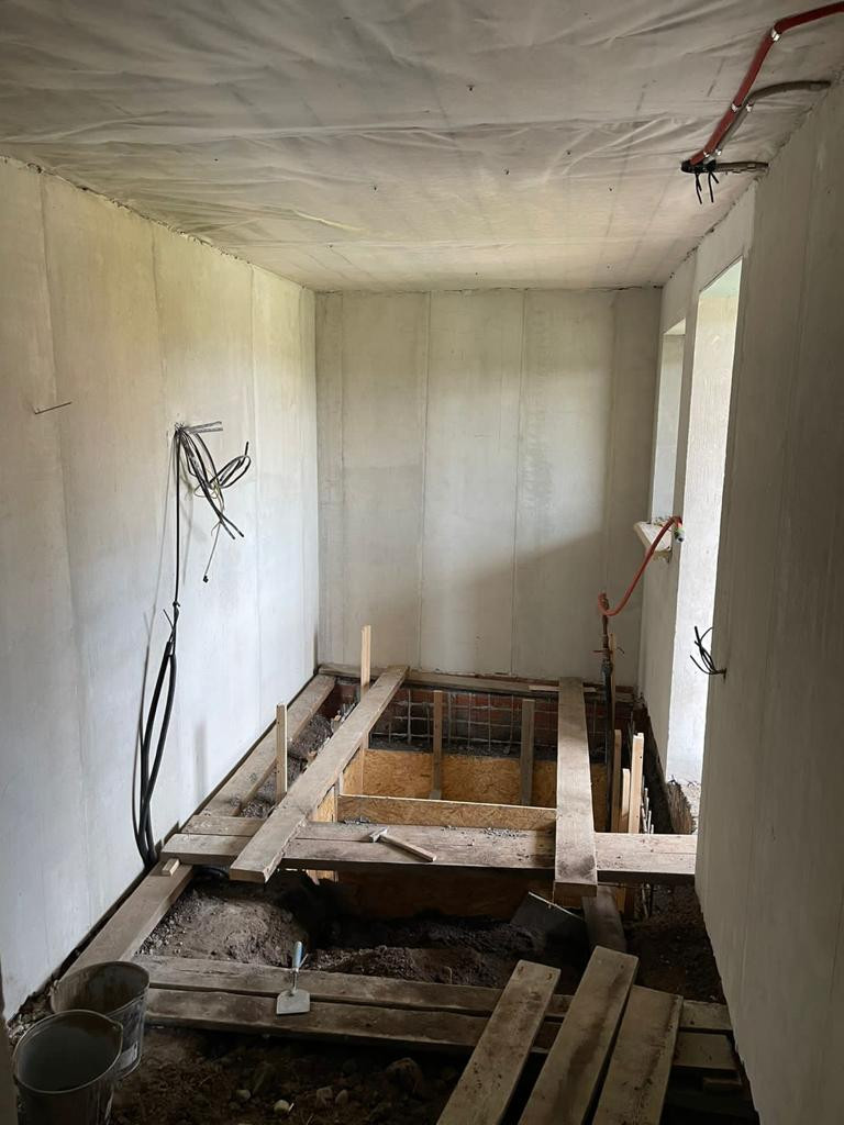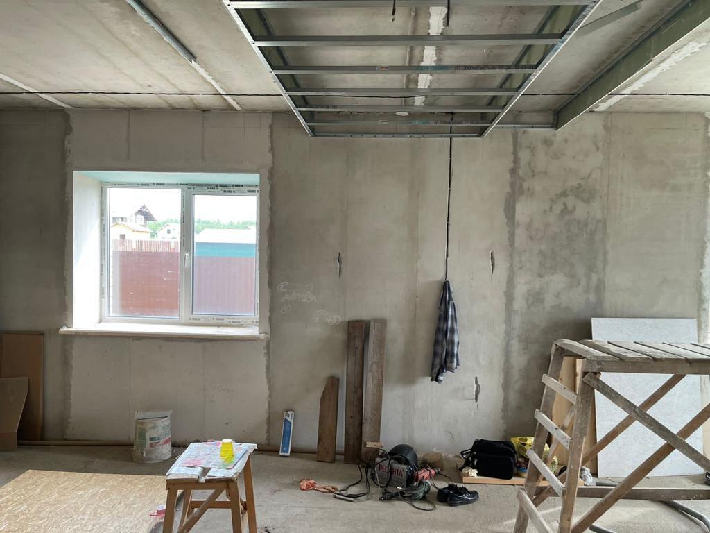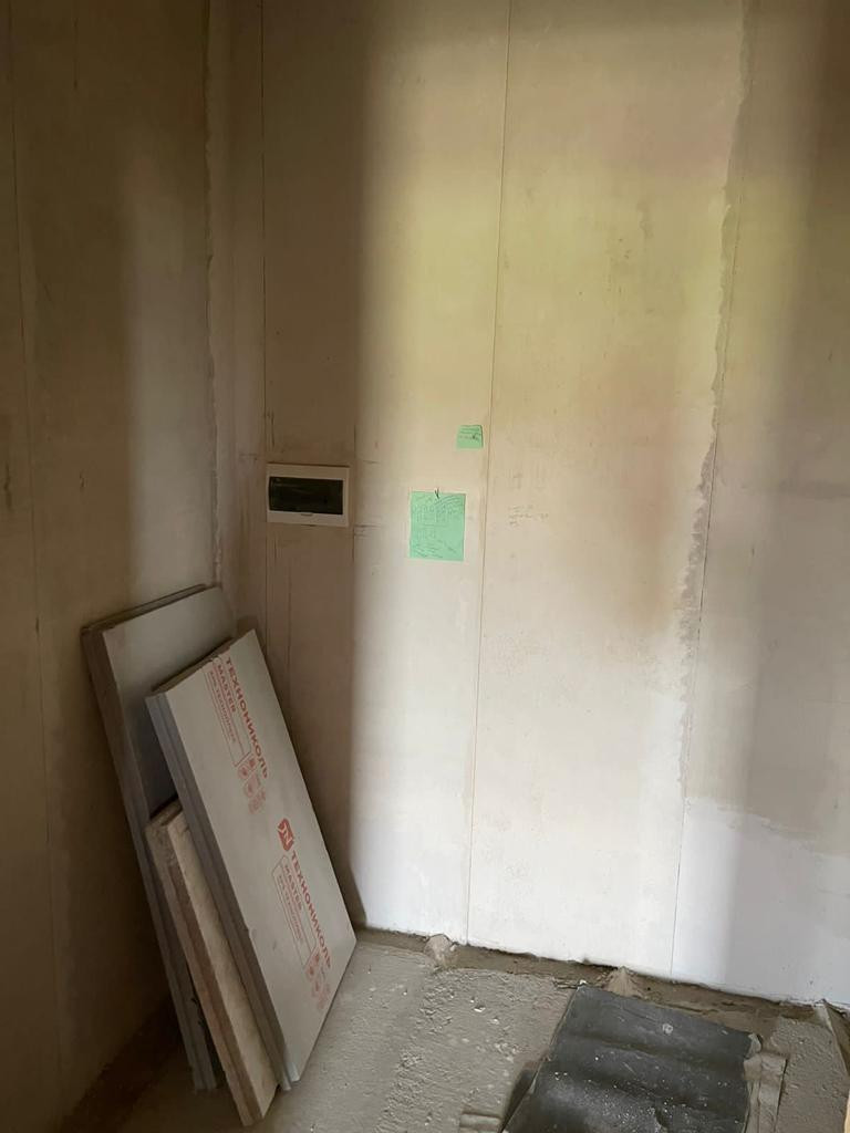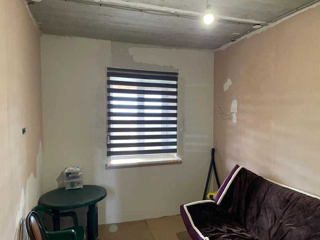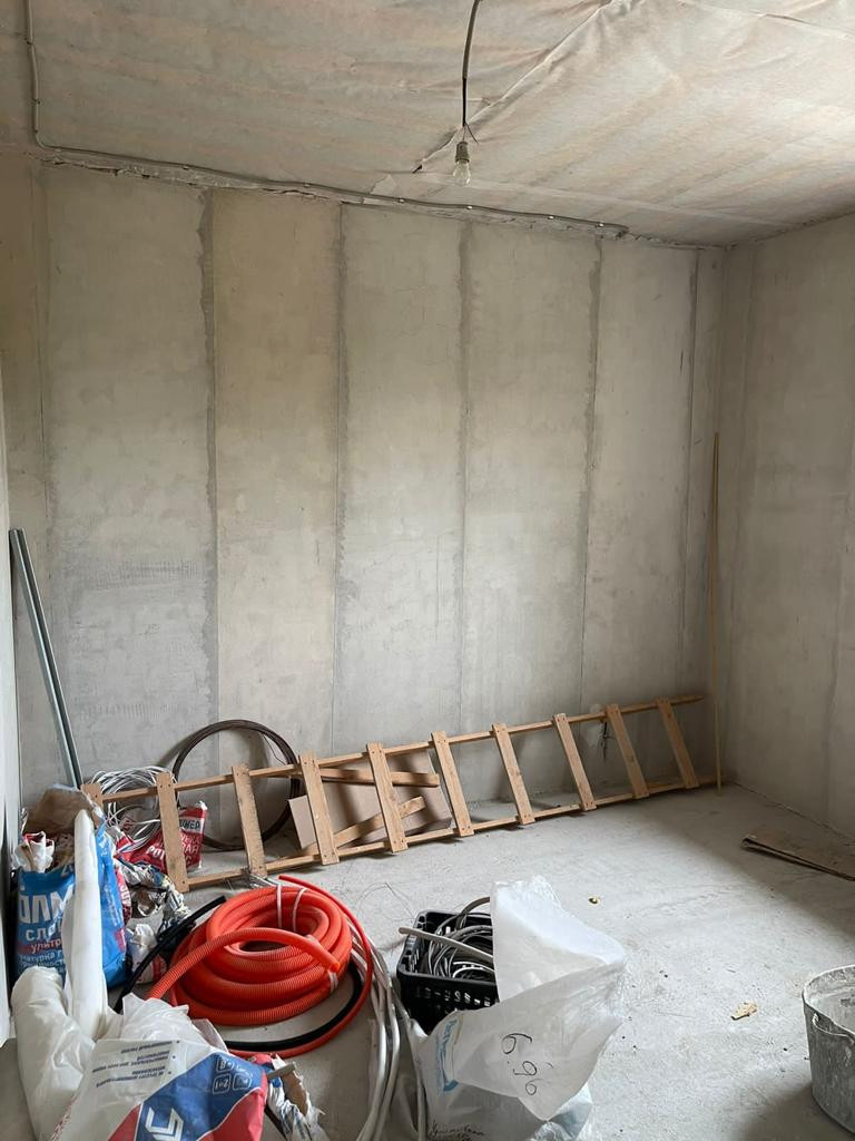 На первом этаже просторная кухня - гостинная 42 кв.м.; санузел ;спальная; прихожая и прачечная-хозблок 10 кв.м.