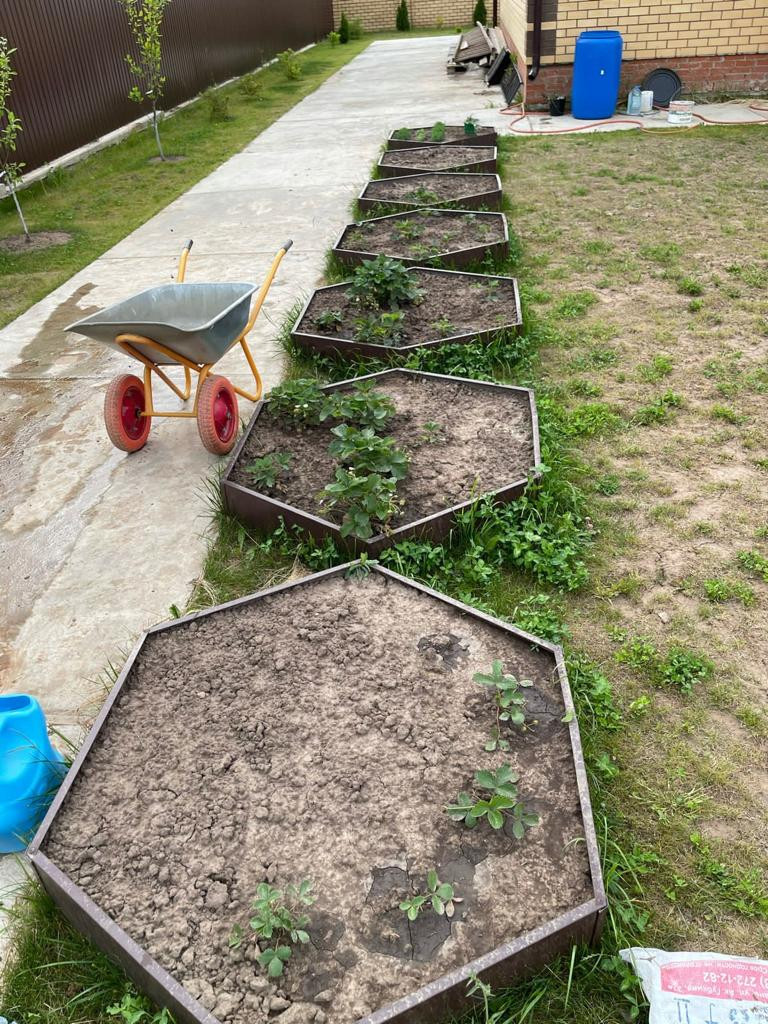 Участок ухожен;застелен газонной травой; есть грядки с различными сортами клубники посажены плодовые деревья и ягодные кустарники.