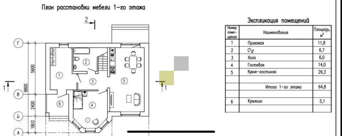 1-й этаж: прихожая 12 кв.м., санузел 7 кв.м., просторная кухня-гостиная 27 кв.м.. с выходом на террасу, спальня 14 кв.м.
