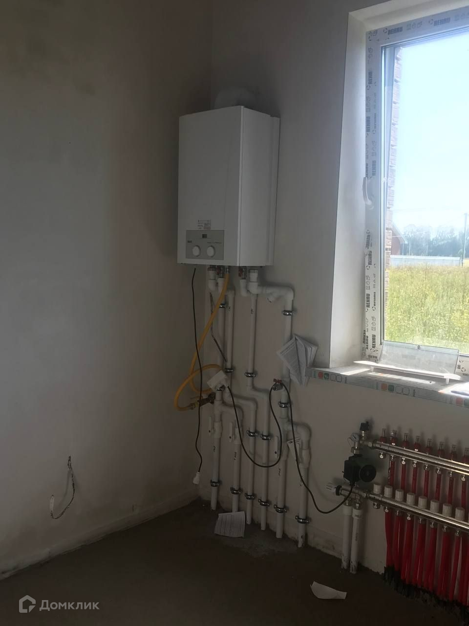 Отопление проведено. Тёплые полы абсолютно по всему дому - 10 контуров. Котёл Baxi, смесительная группа тоже итальянская. Циркуляционный насос Grundfos (Германия). Под окнами батареи.
