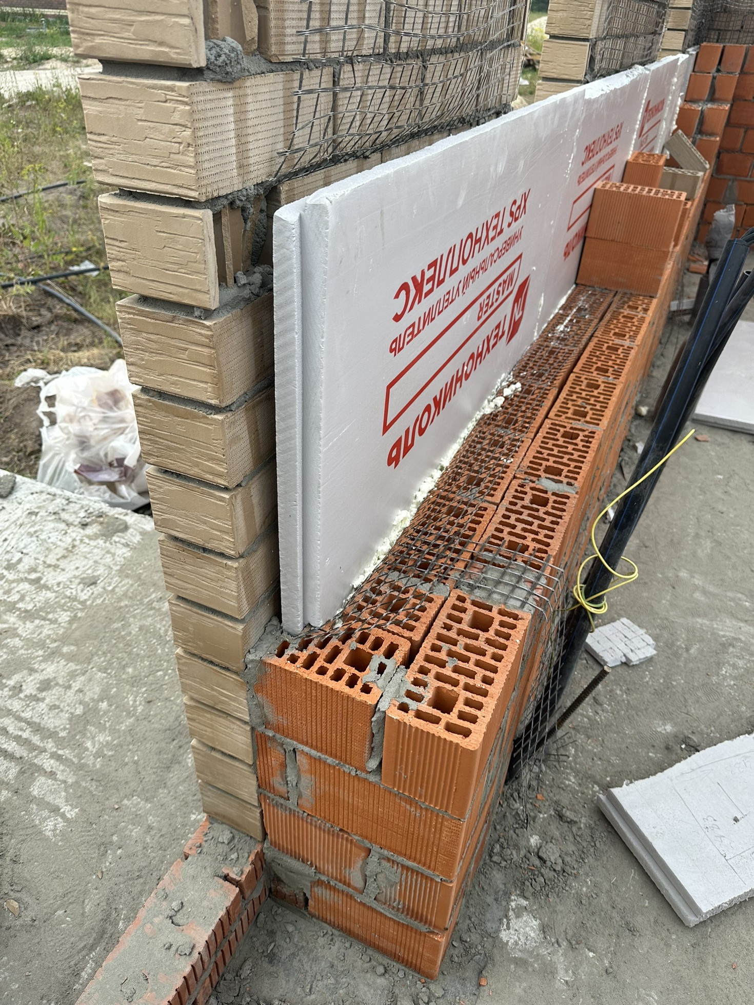 Стена 450. Облицовочный кирпич, 20 мм вентзазор, утеплитель экструдированный пенополистирол 50мм, черновая кладка красный керамический кирпич 250 мм. Утеплитель Экструдированный пенополистирол (XPS) 50мм полностью пропенен по всему контуру. Есть много споров на тему утеплителя, но этот самый тёплый для стен.