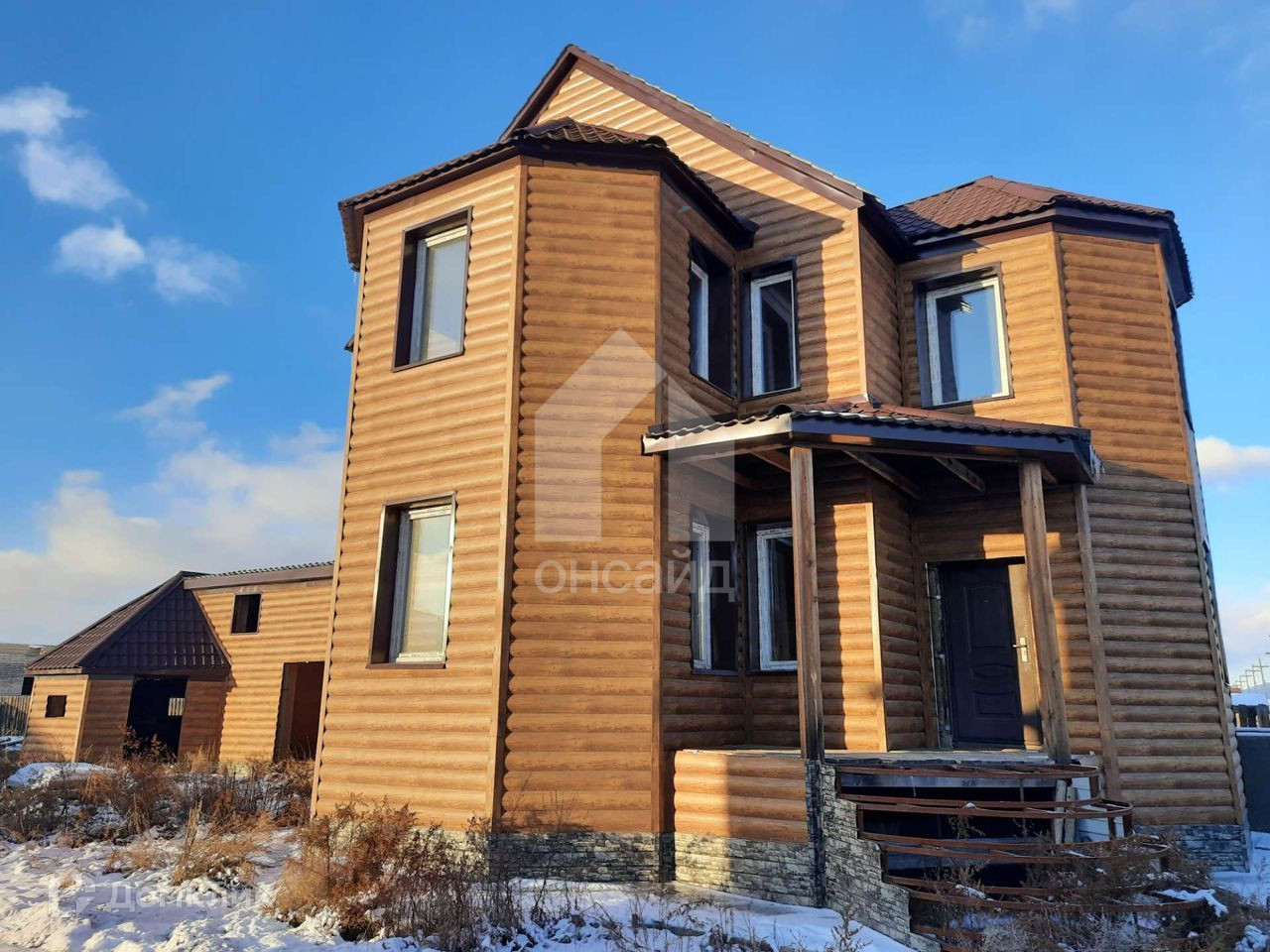 Сруб из бруса , утепленного в три слоя базальтовой плитой 3×50=150мм. и обшит текстурированным металлосайдингом.