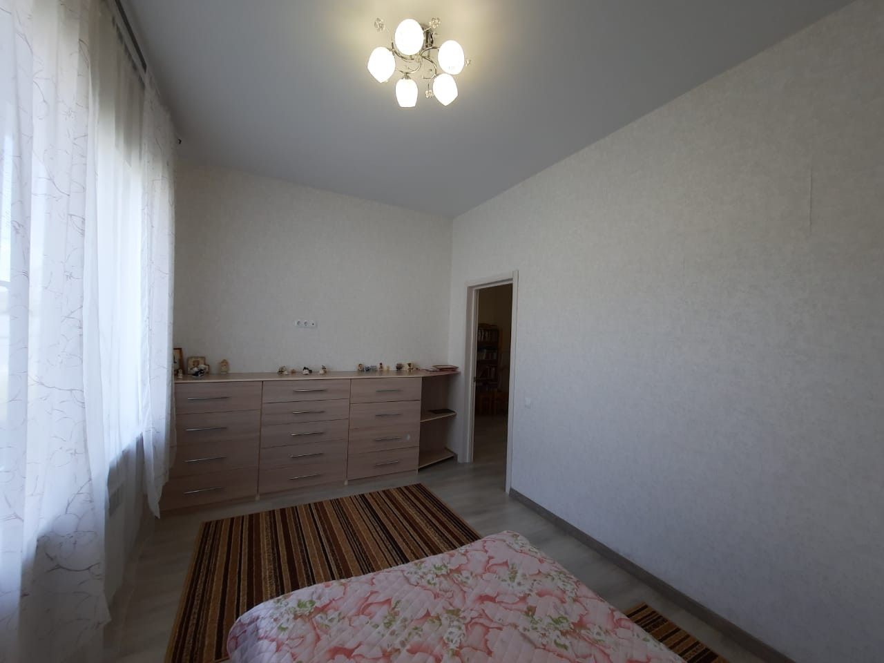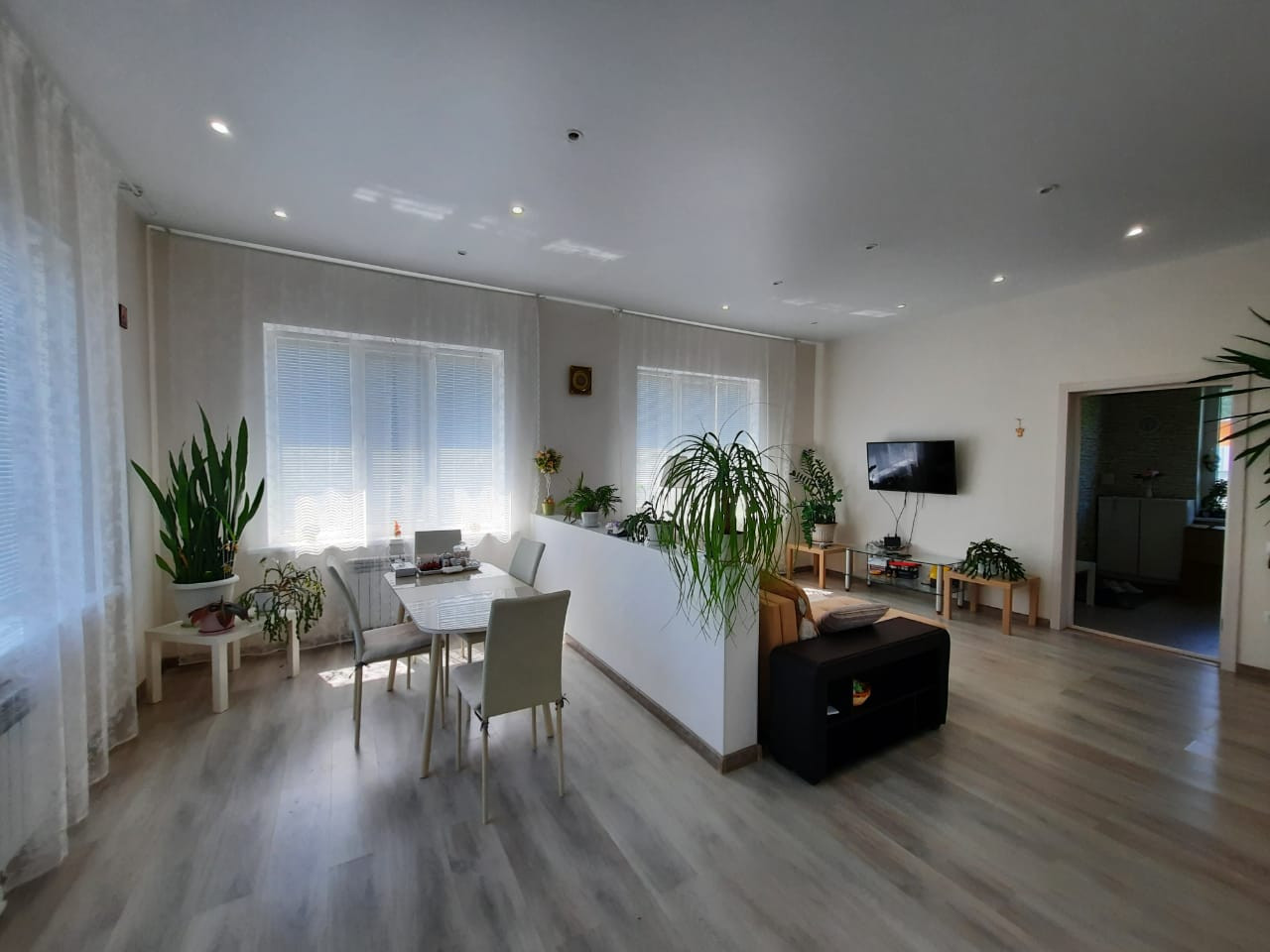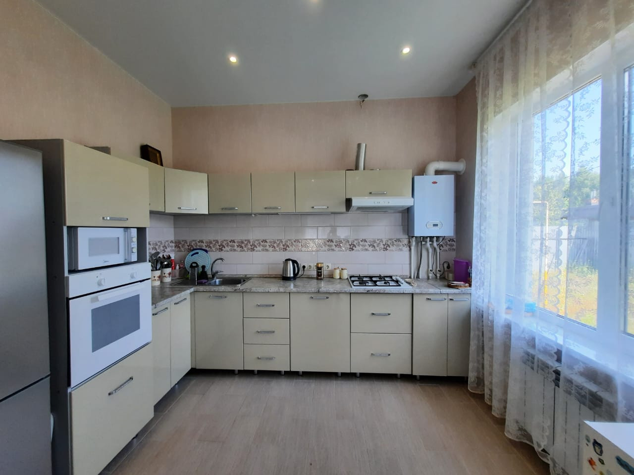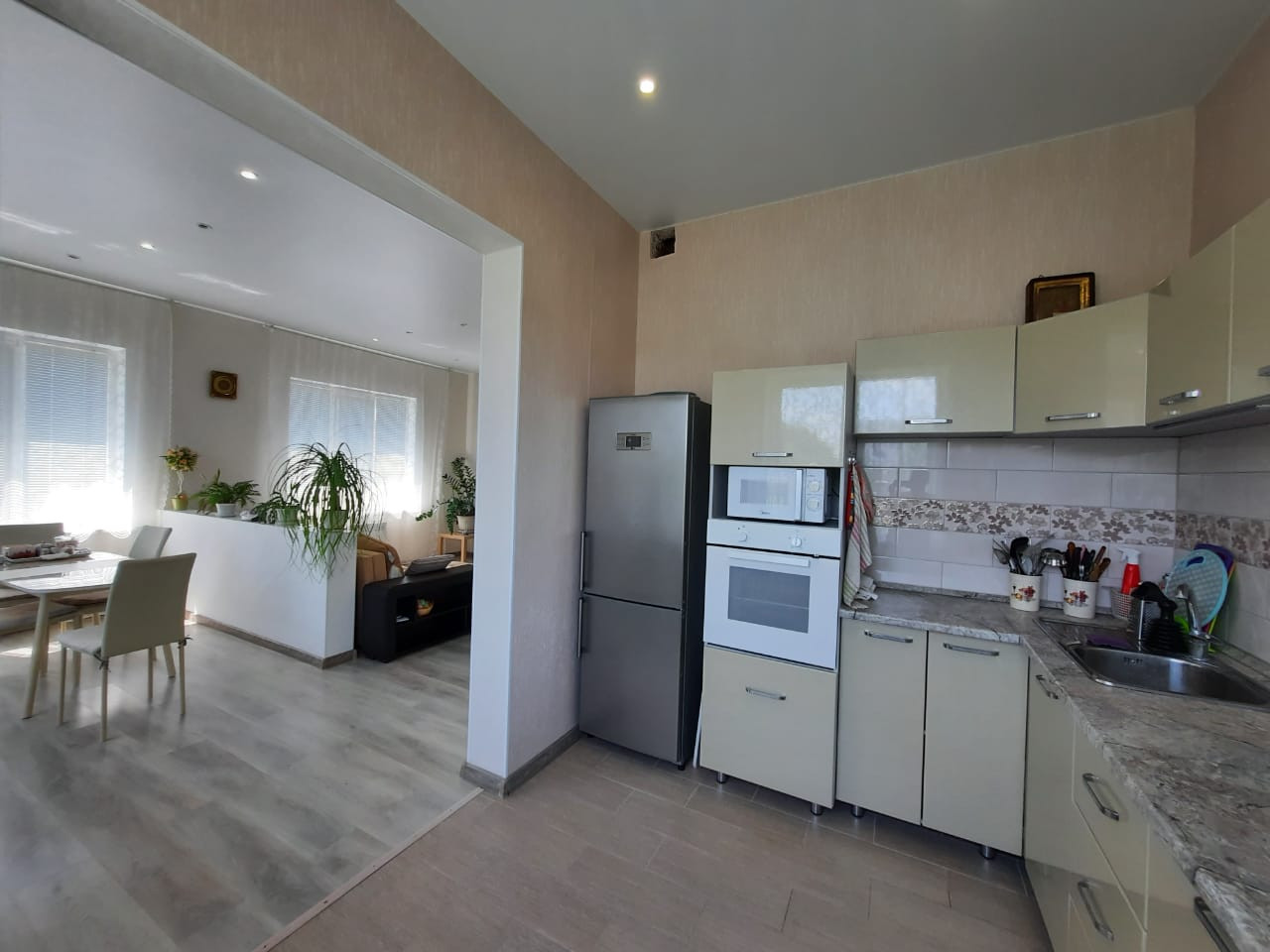 Аккуратный современный ремонт: на полу ламинат, в прихожей, на кухне и санузле – плитка; натяжные потолки; на стенах – обои; красивые межкомнатные двери. Все выполнено в нежных тонах.