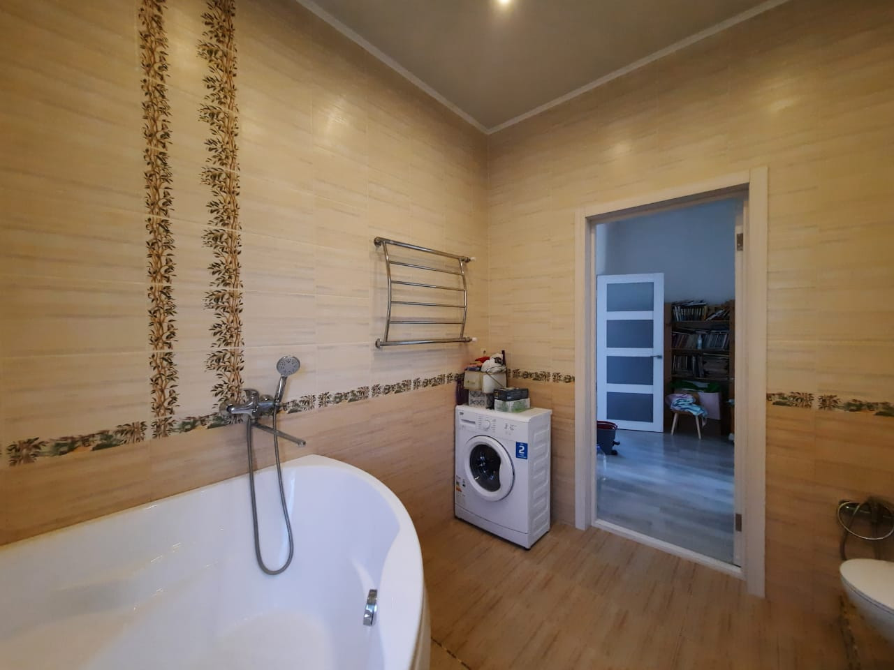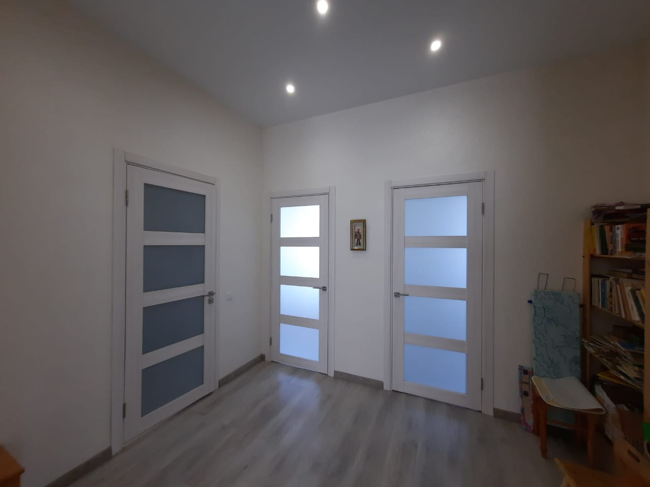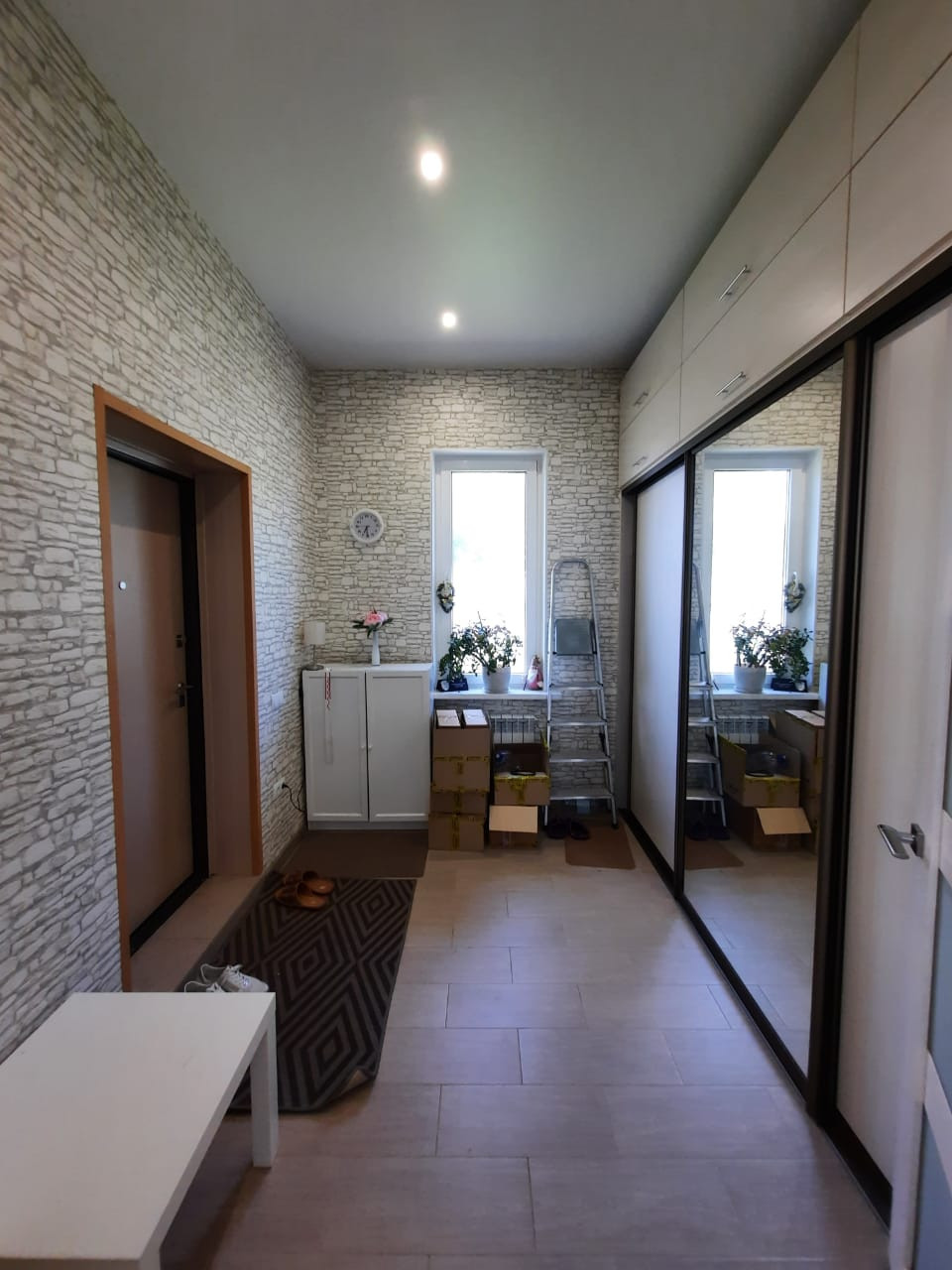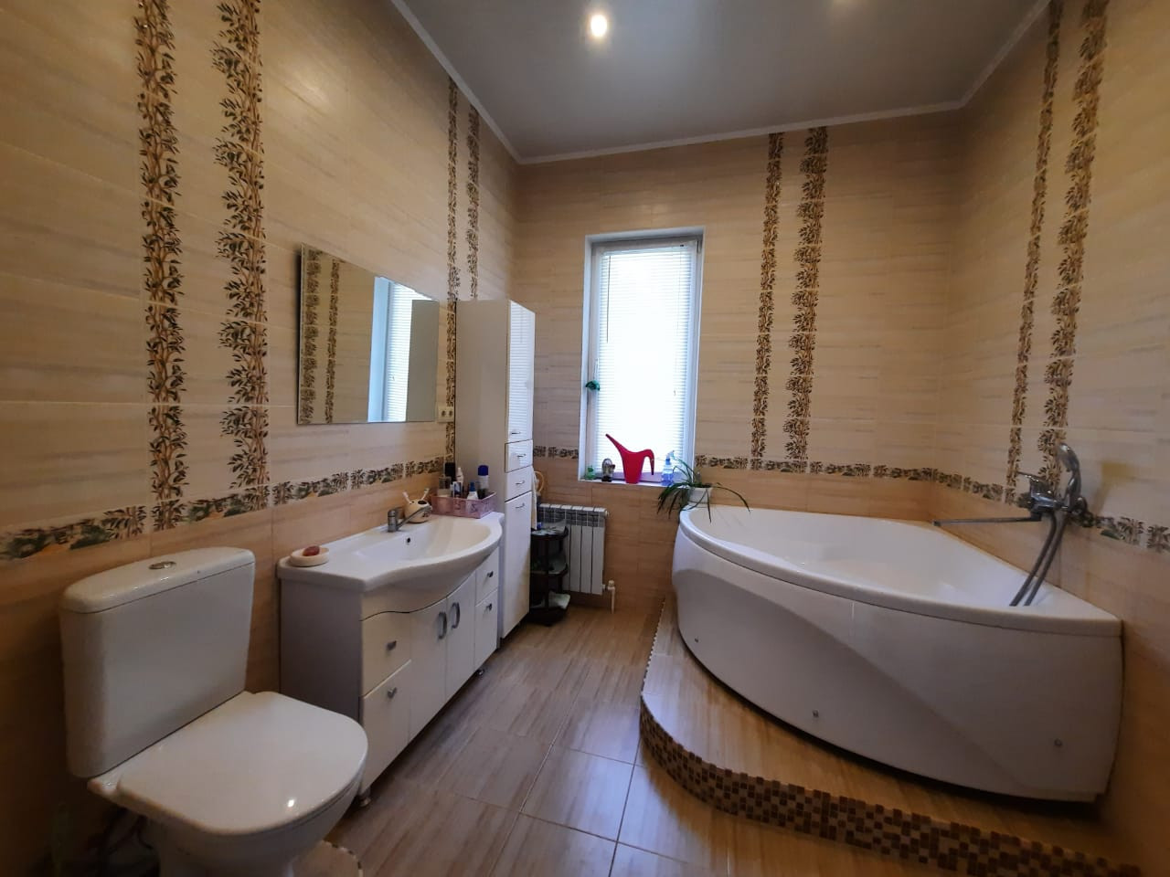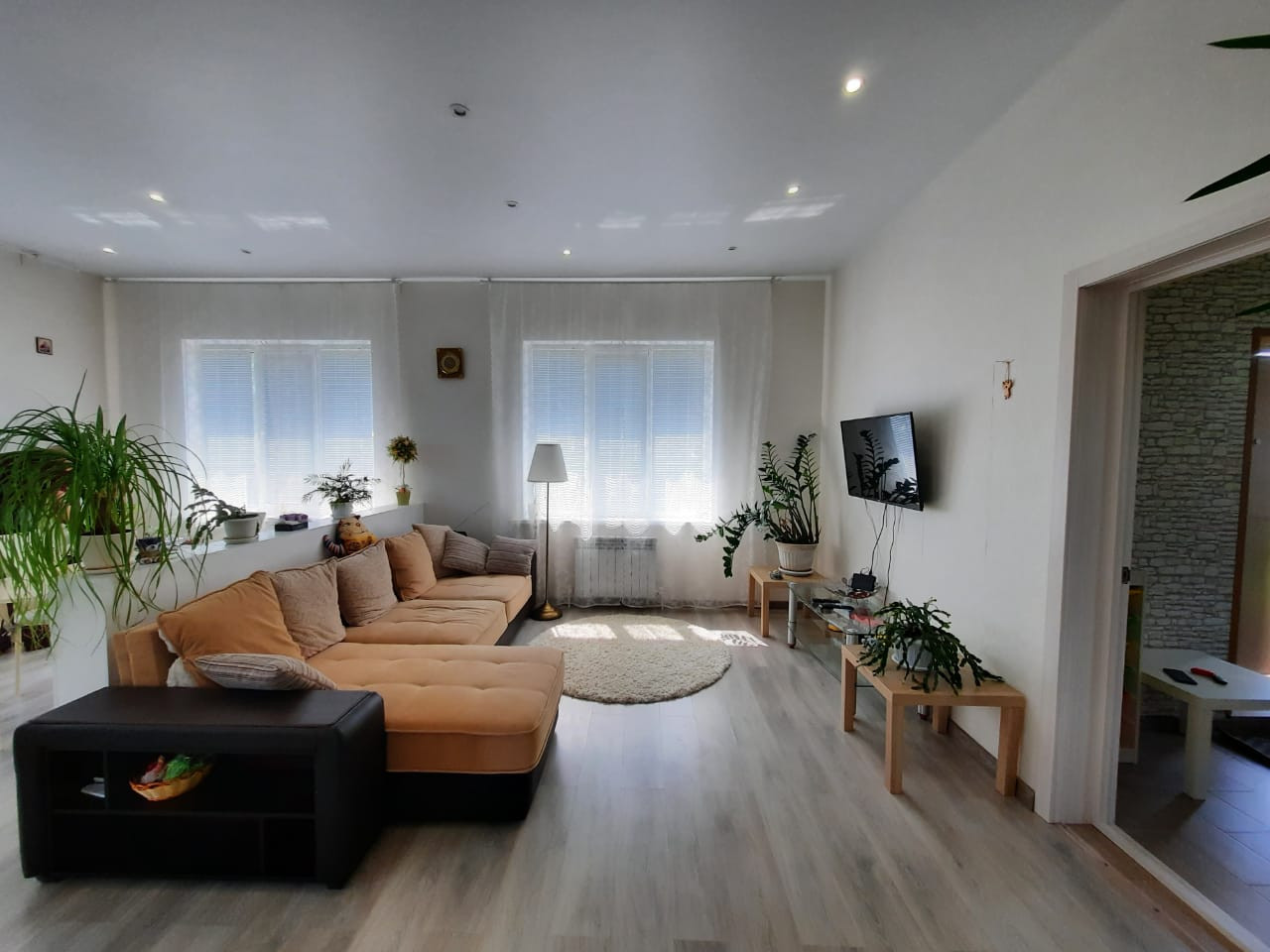 Аккуратный современный ремонт: на полу ламинат, в прихожей, на кухне и санузле – плитка; натяжные потолки; на стенах – обои; красивые межкомнатные двери. Все выполнено в нежных тонах.
