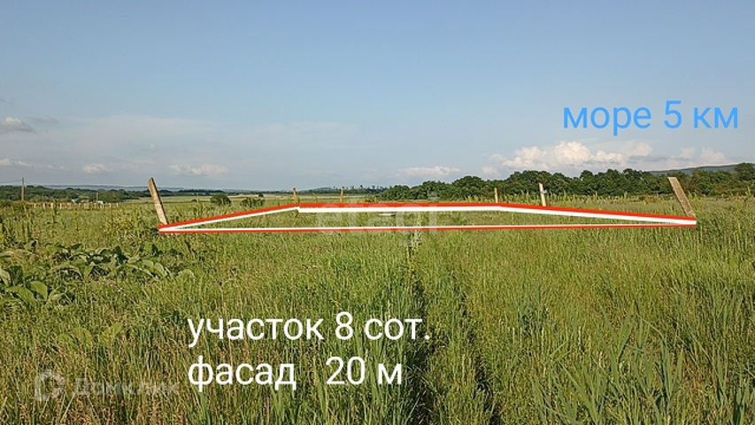 Участок правильной формы, площадью 8 соток: фасад участка - 20метров, глубина - 40метров, находится на возвышенности (сухой).