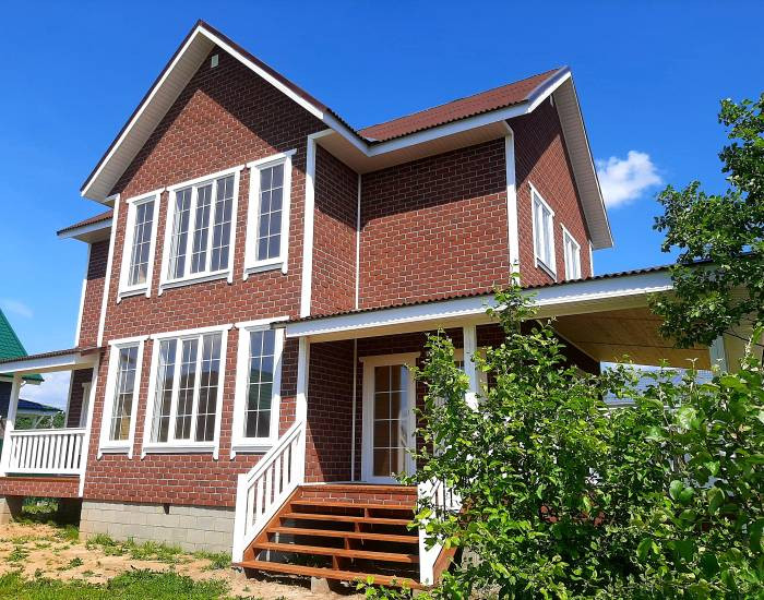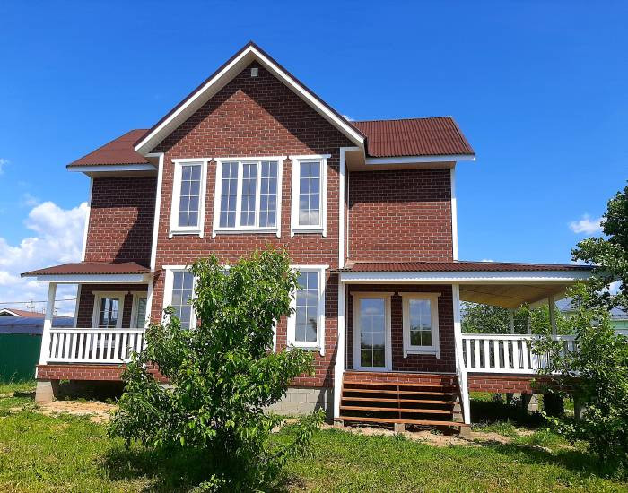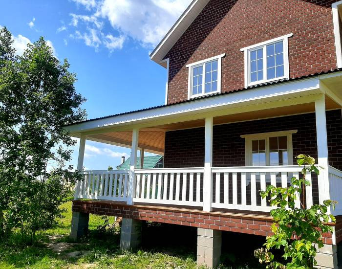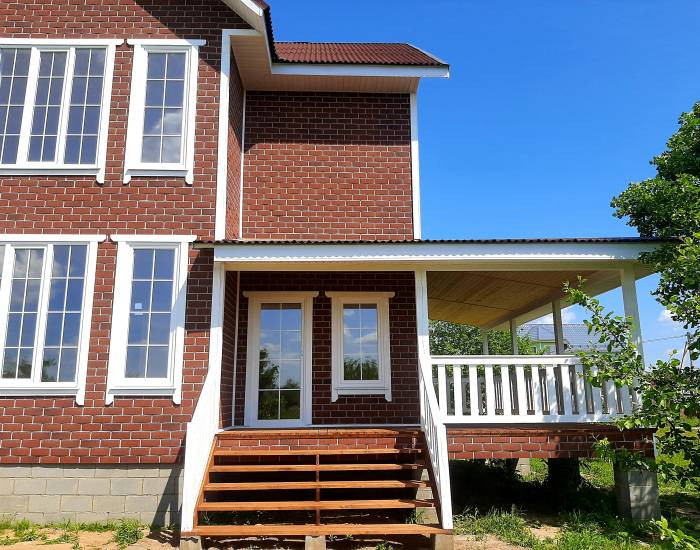 Дом с функциональной планировкой, эффектным фасадом, панорамными окнами в пол. Есть веранда. Ленточный фундамент.
