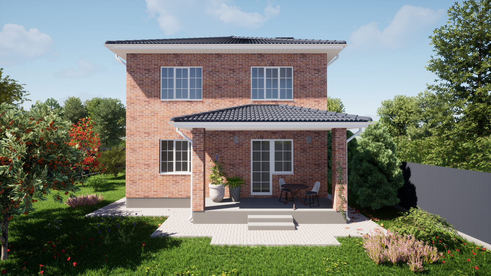 Во дворе смонтирована дорожка от калитки до дома, место под автомобиль и отмостка по периметру дома.
