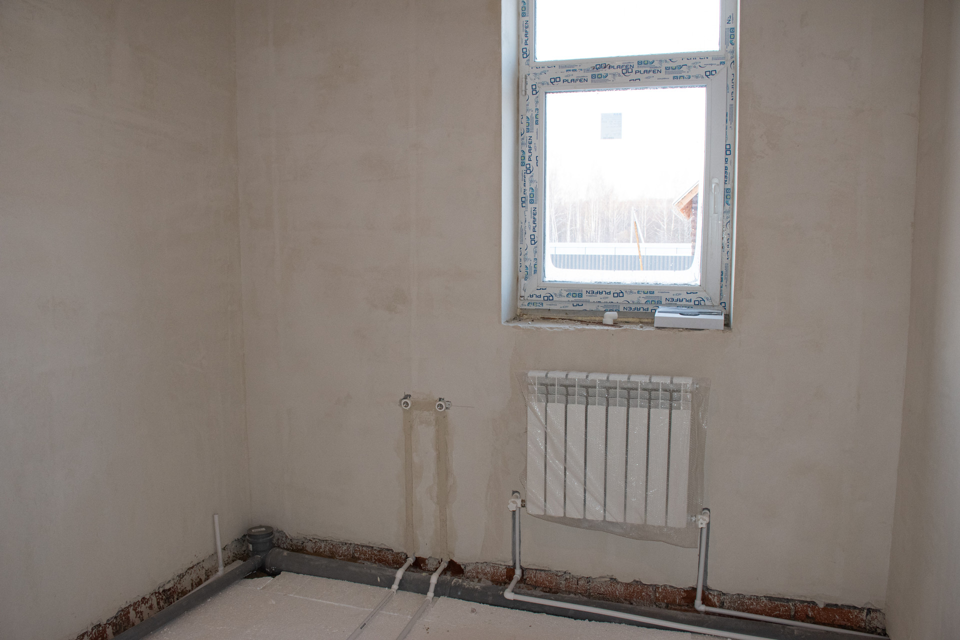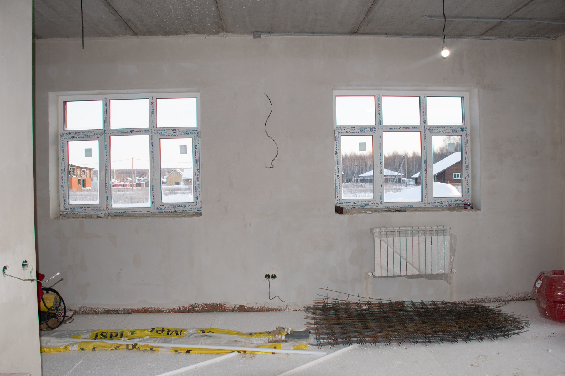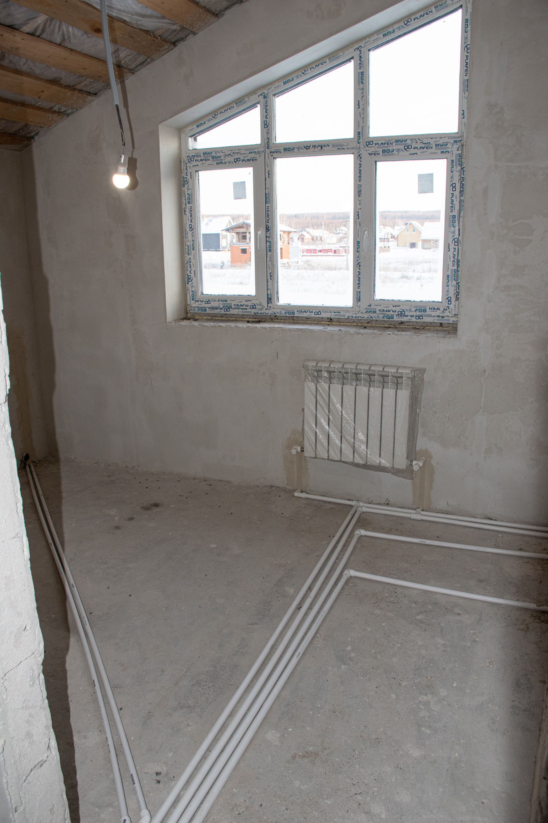 Пол – водяной теплый по всему 1-этажу, выполнена полусухая стяжка по маякам (под ламинат/линолеум).