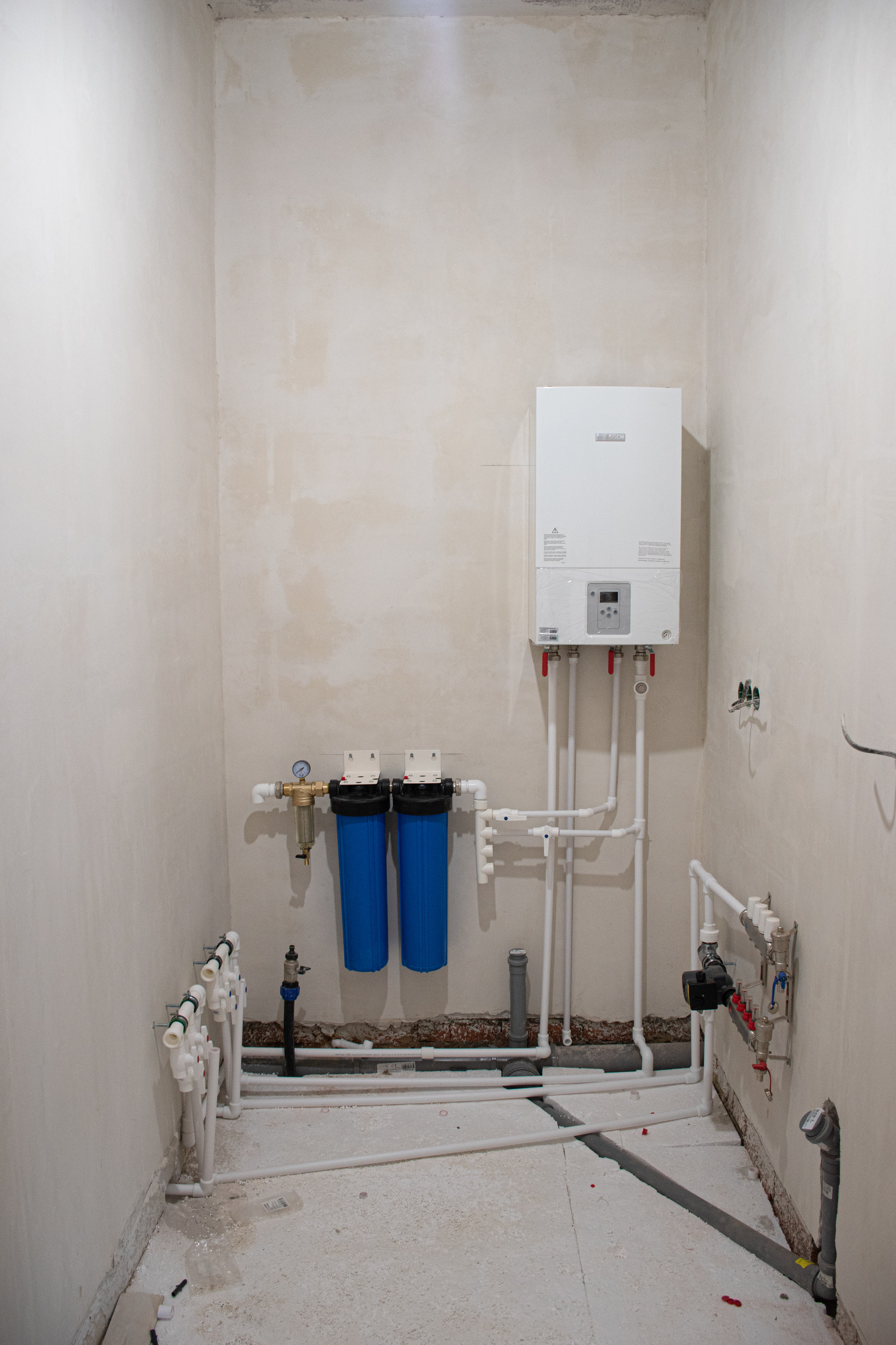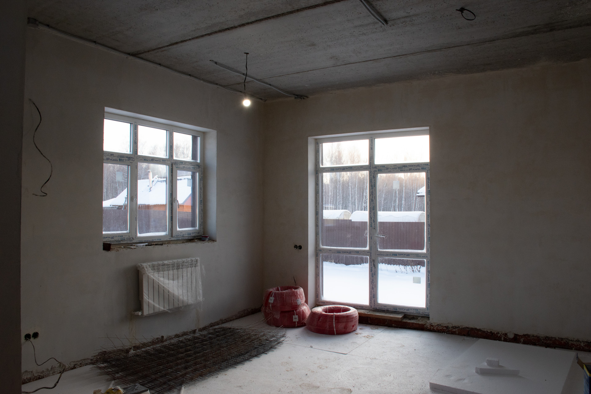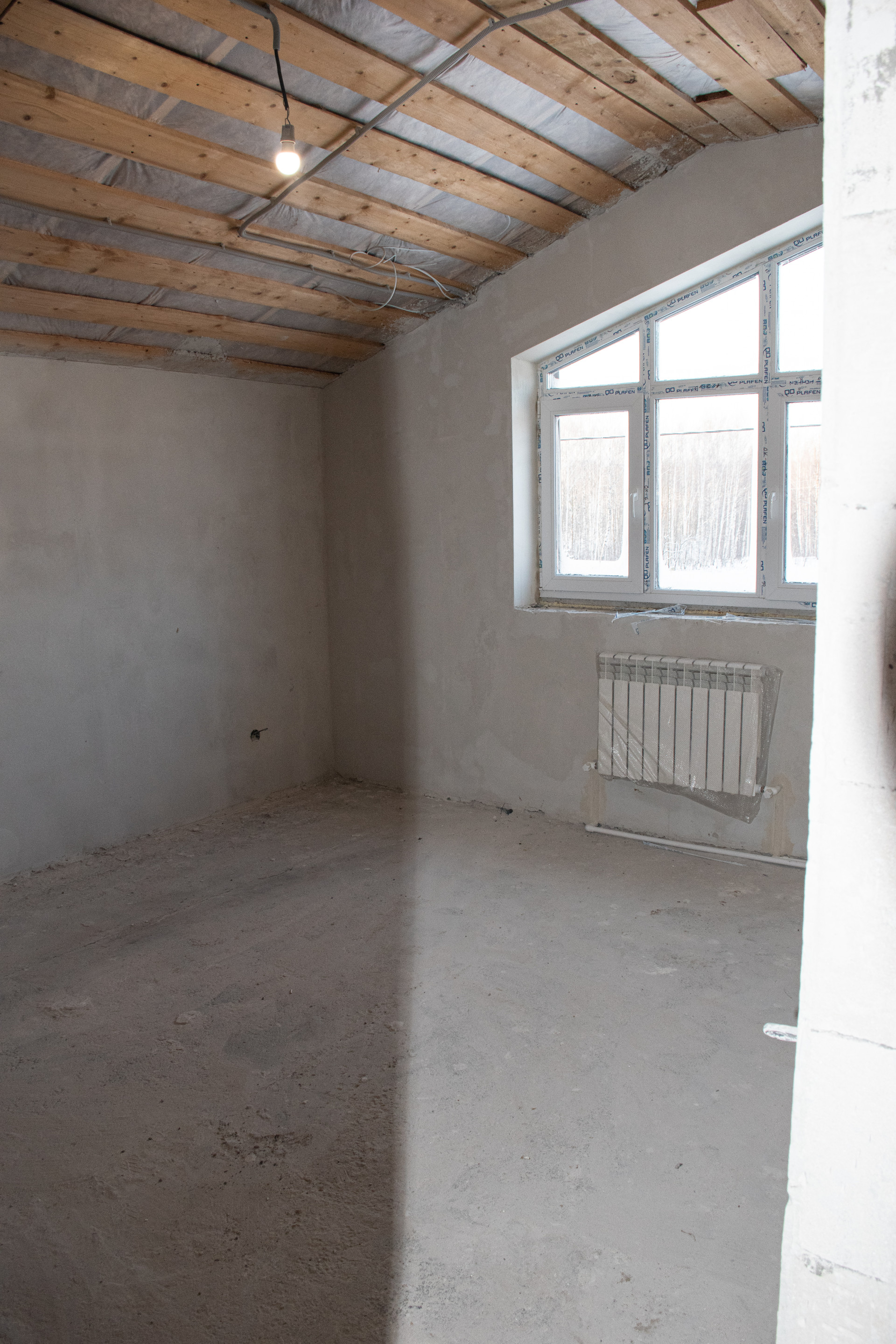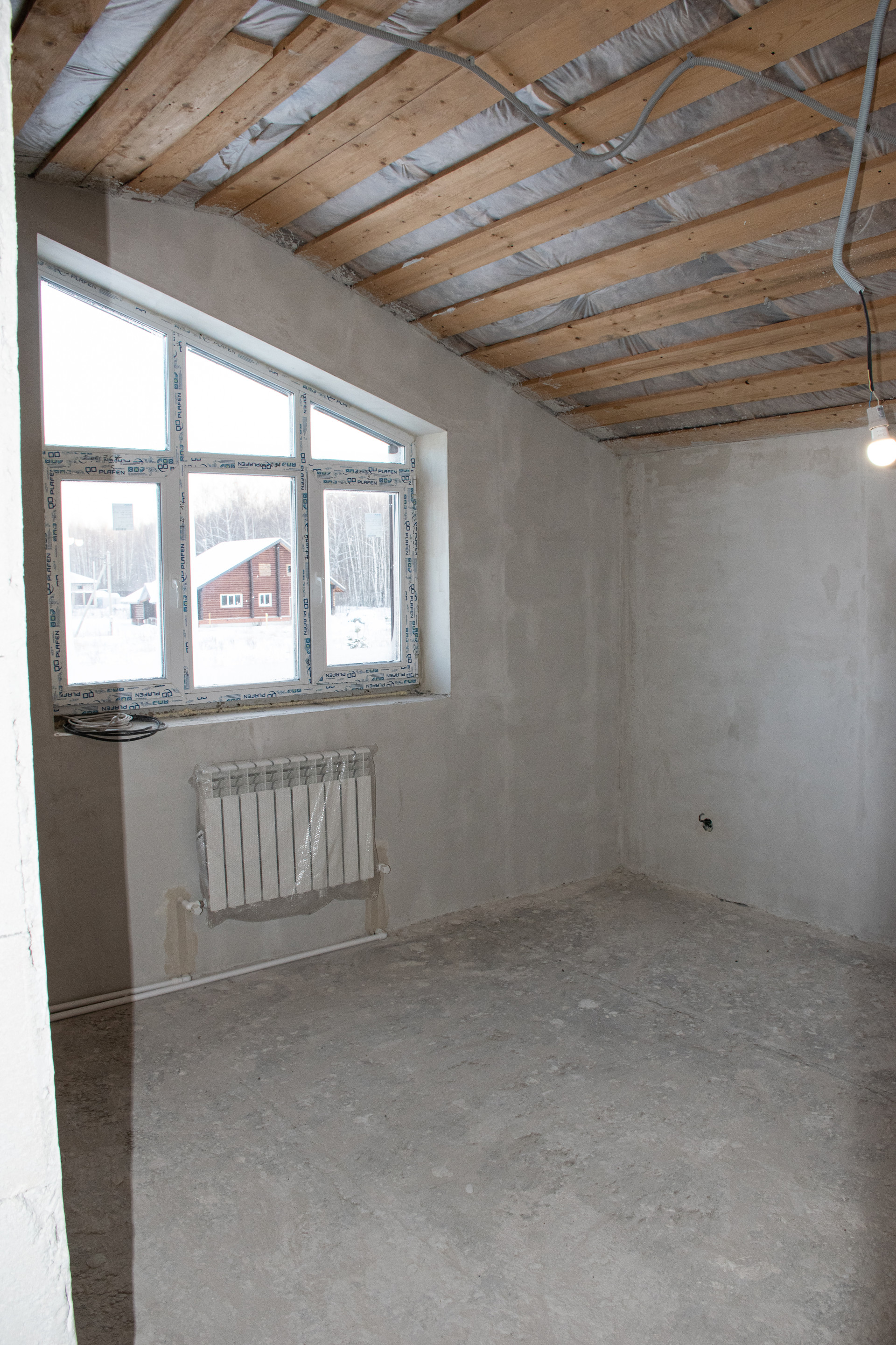 Пол – водяной теплый по всему 1-этажу, выполнена полусухая стяжка по маякам (под ламинат/линолеум).