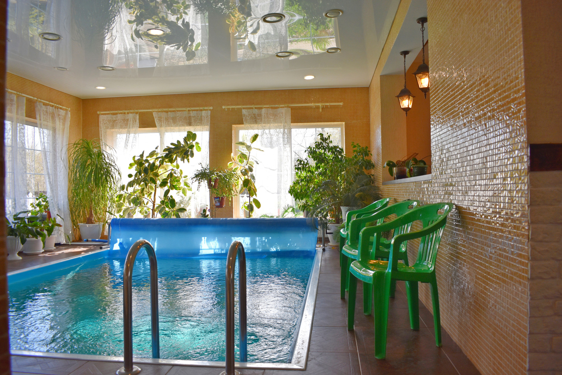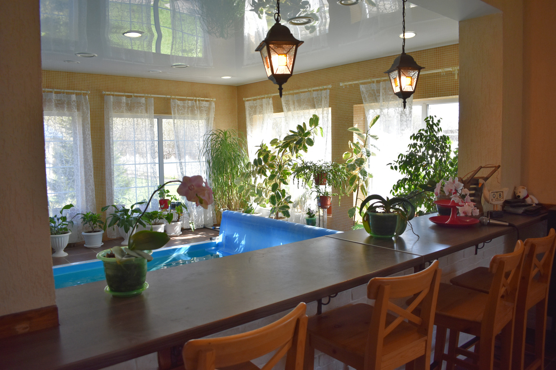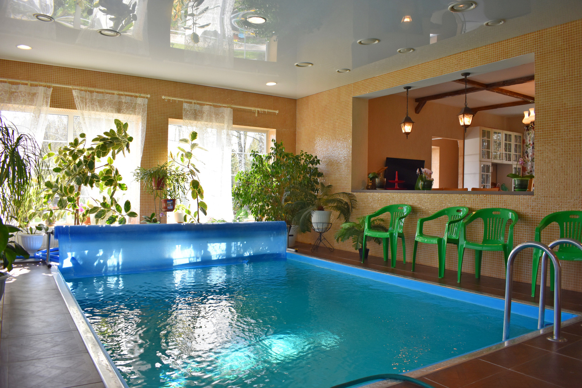 1-й этаж: кухня, зал, бассейн, сауна, c\у.