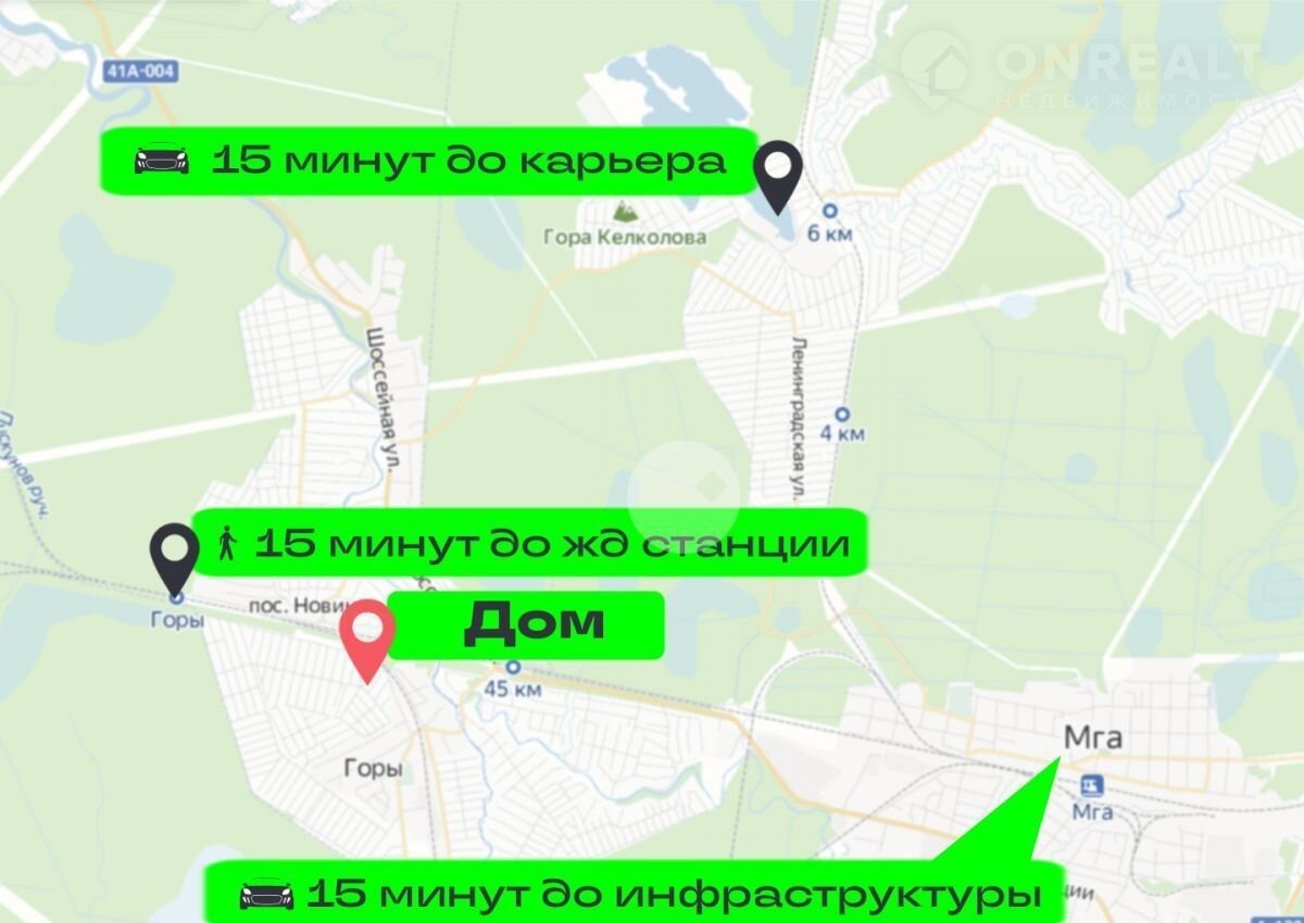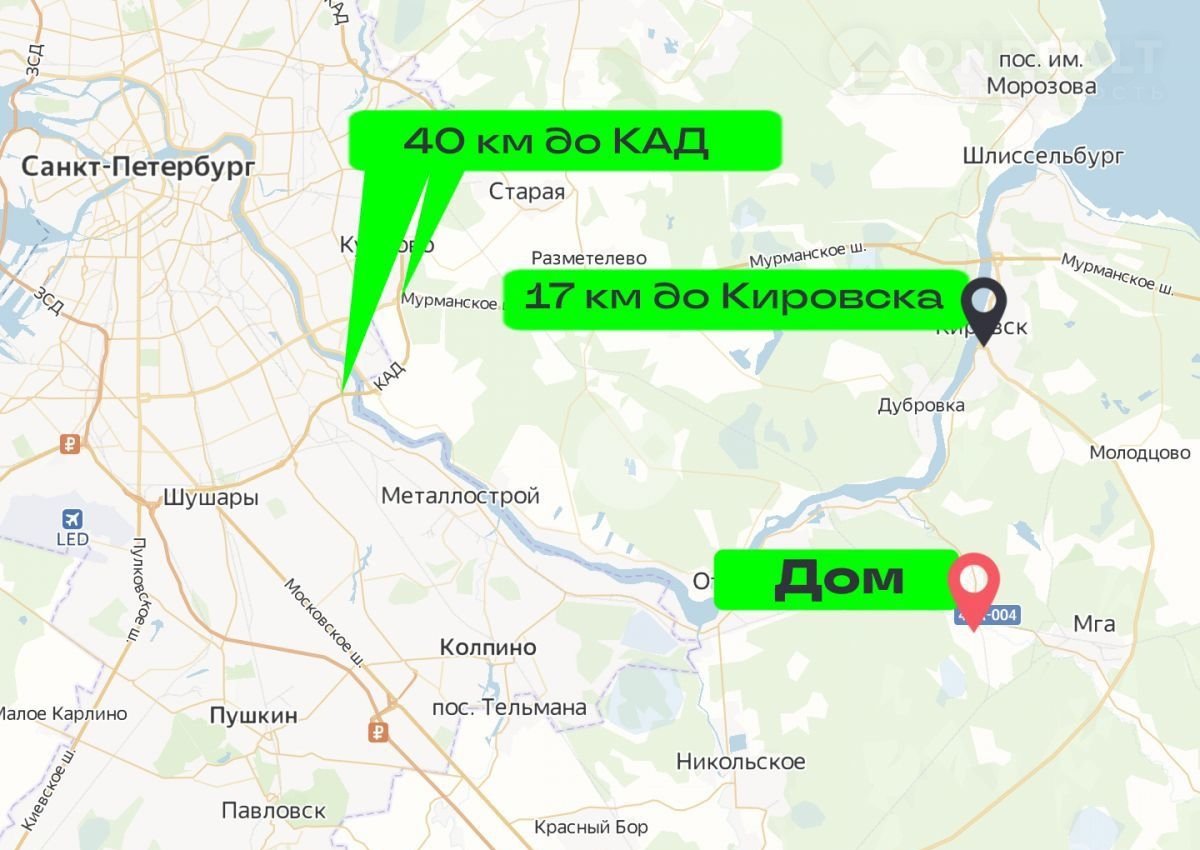 Доехать до участка можно на электричке с Московского или Ладожского вокзала до ж.д. станции Горы (время в пути 1 час). От станции до дома 1,5 км (15 - 20 минут пешком). На автомобиле дорога от Санкт-Петербурга займёт 1 час по Мурманскому или Петрозаводскому шоссе.