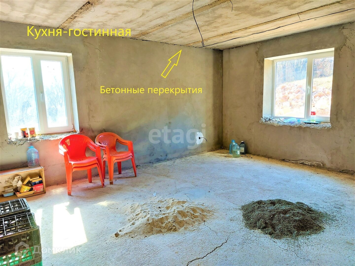 Крыша профнастил, окна металлопластиковые, электрическая проводка разведена на первом этаже, полы стяжка.