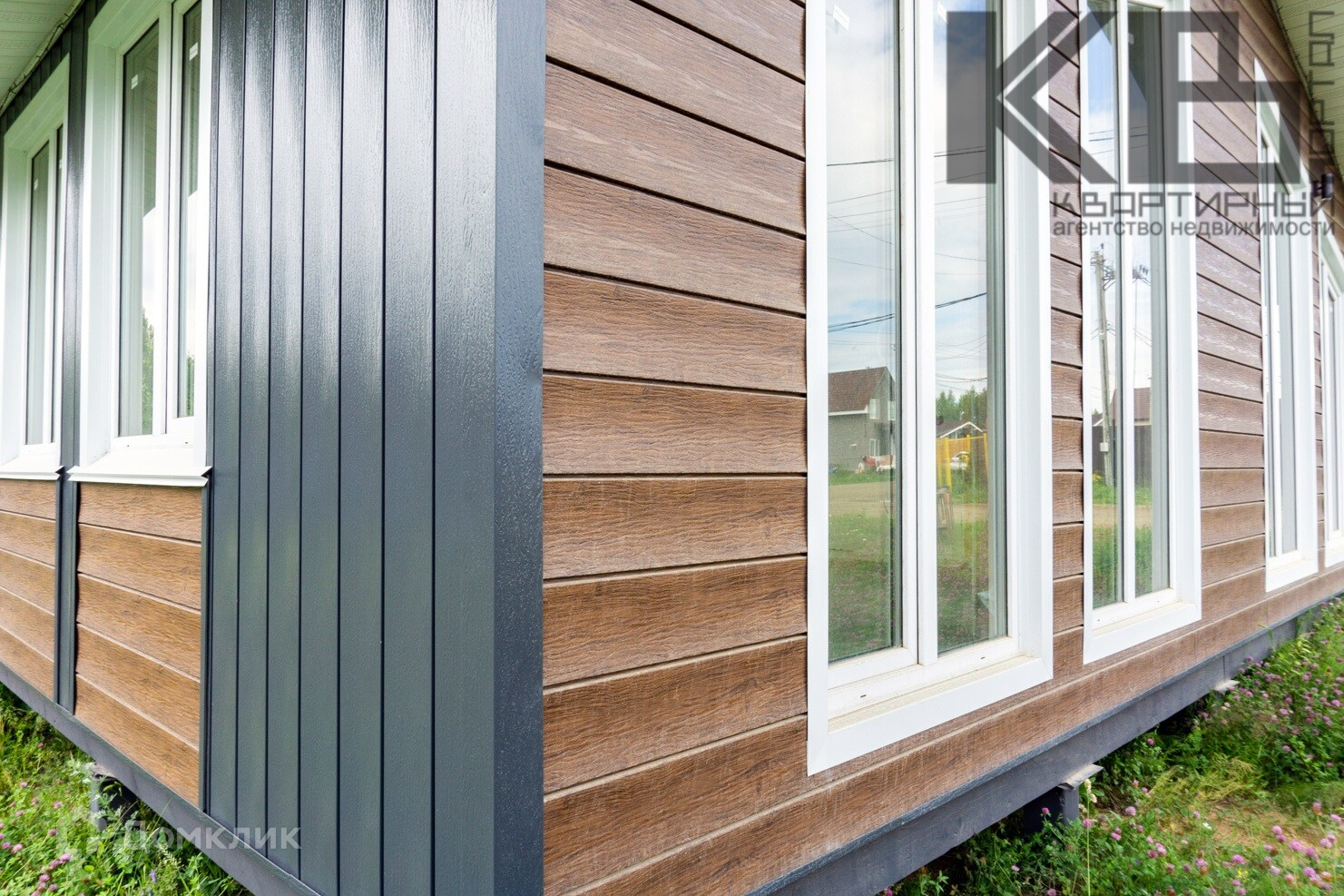 9. Снаружи фасад отделан линеарными панелями с текстурой, в двух цветах, темно-серый и темный дуб. Фасад смонтирован на подсистему(т.е. с вентиляционным зазором), согласно требованиям.