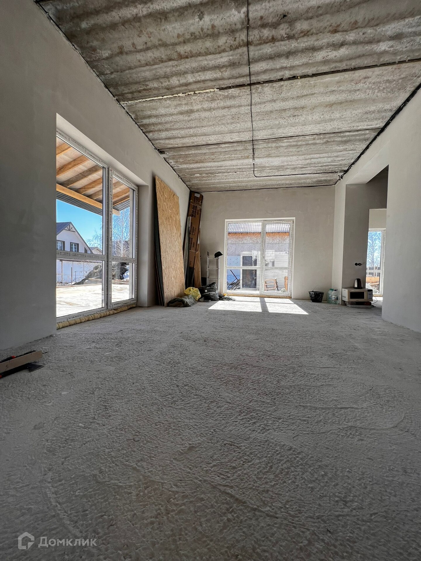 Материал стен: сибит (400 см), ленточный фундамент (высота 190 см), терраса-доска (150 см), в доме выполнена стяжка, теплые полы, на первом, втором этаже. Стены отштукатурены, установлена лестница, все готово к завершающей стадии ремонта.
