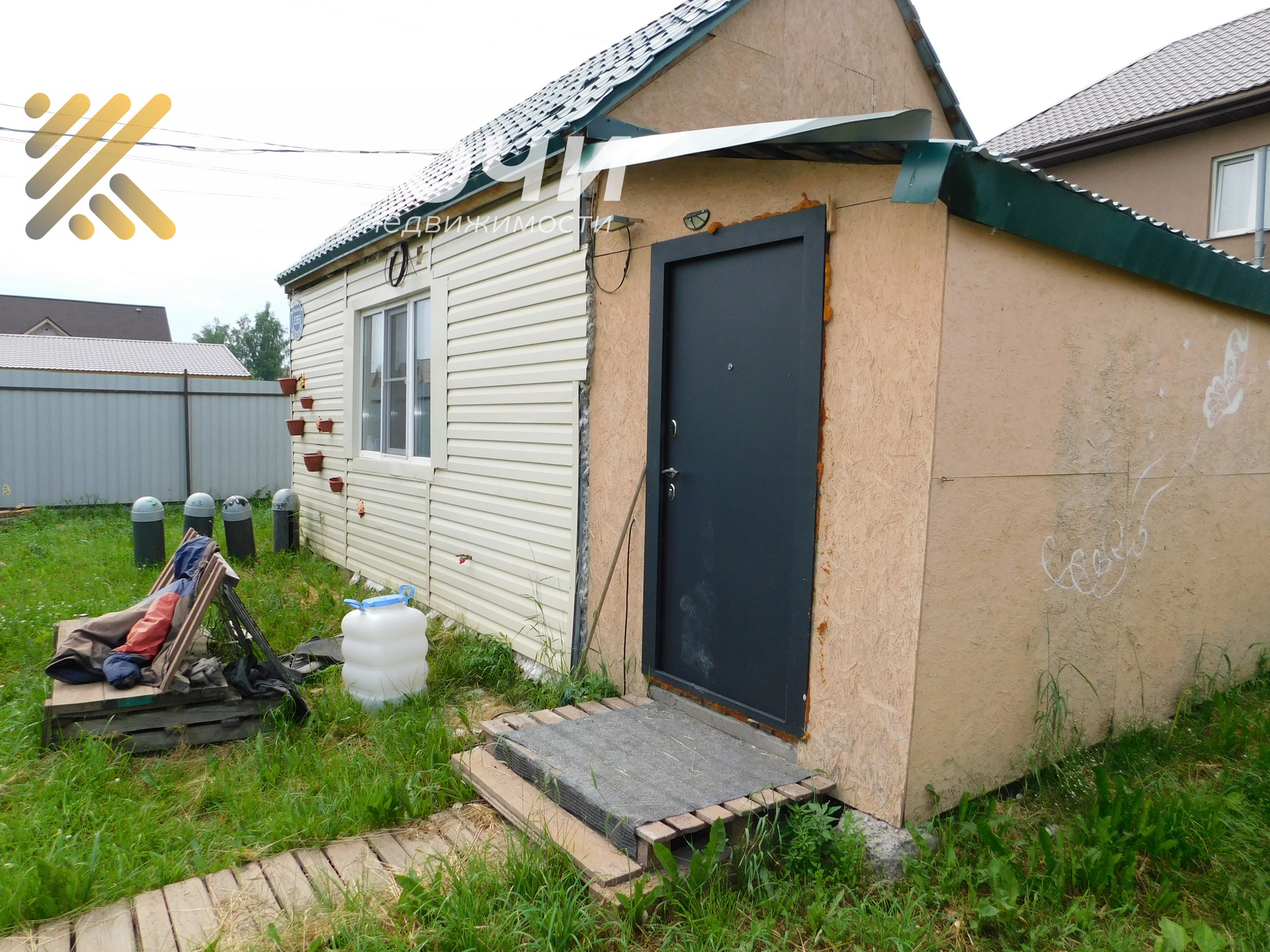 Домик из бруса обшит сайдингом и утеплителем, все коммуникации заведены можно жить зимой. На участке еще есть место для постройки большого дома этот маленький можно переделать под баню.