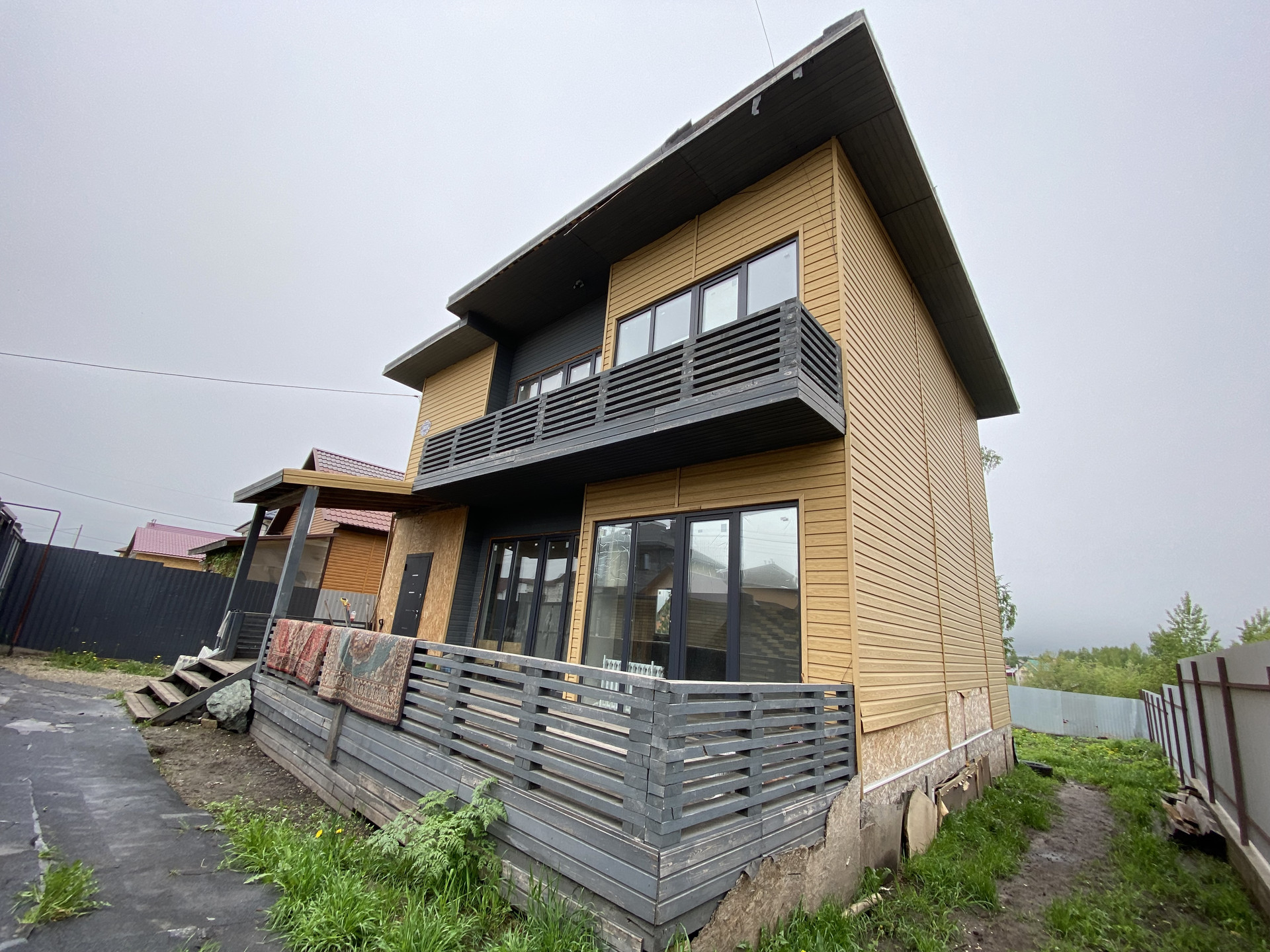 Дом с частичным ремонтом, огорожен забором. Дом стоит на сваях. Каркасник, обшит сайдингом.