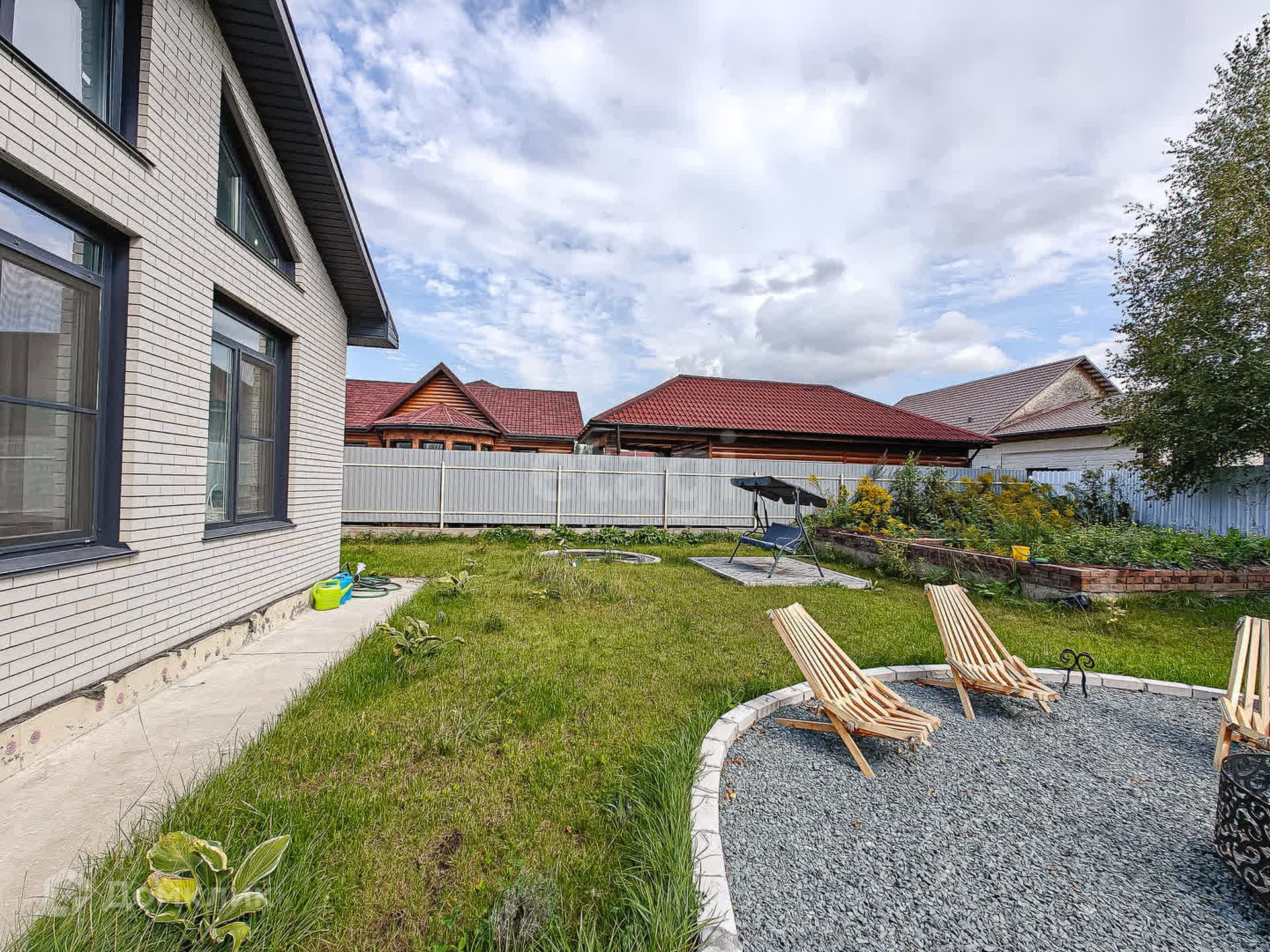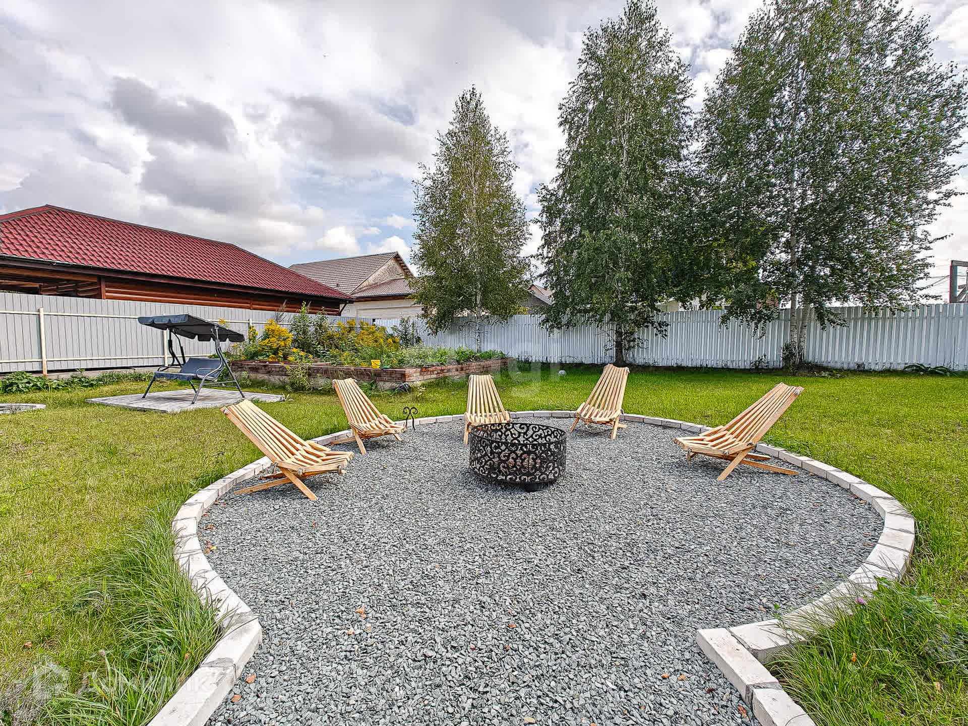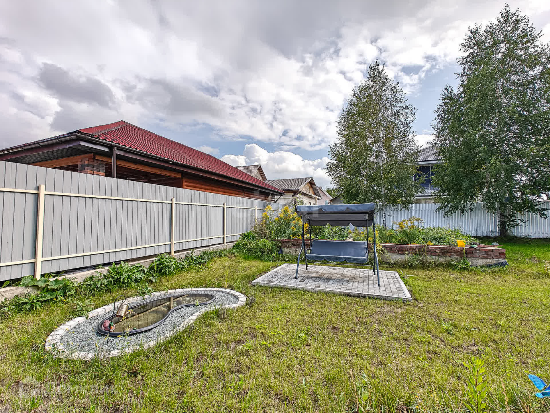 Со всех сторон участок огорожен забором. Выполнено благоустройство: газон, зона отдыха с очагом, гамаки, качеля, прудик. Участок ровный, угловой, всего 2 смежных участка.