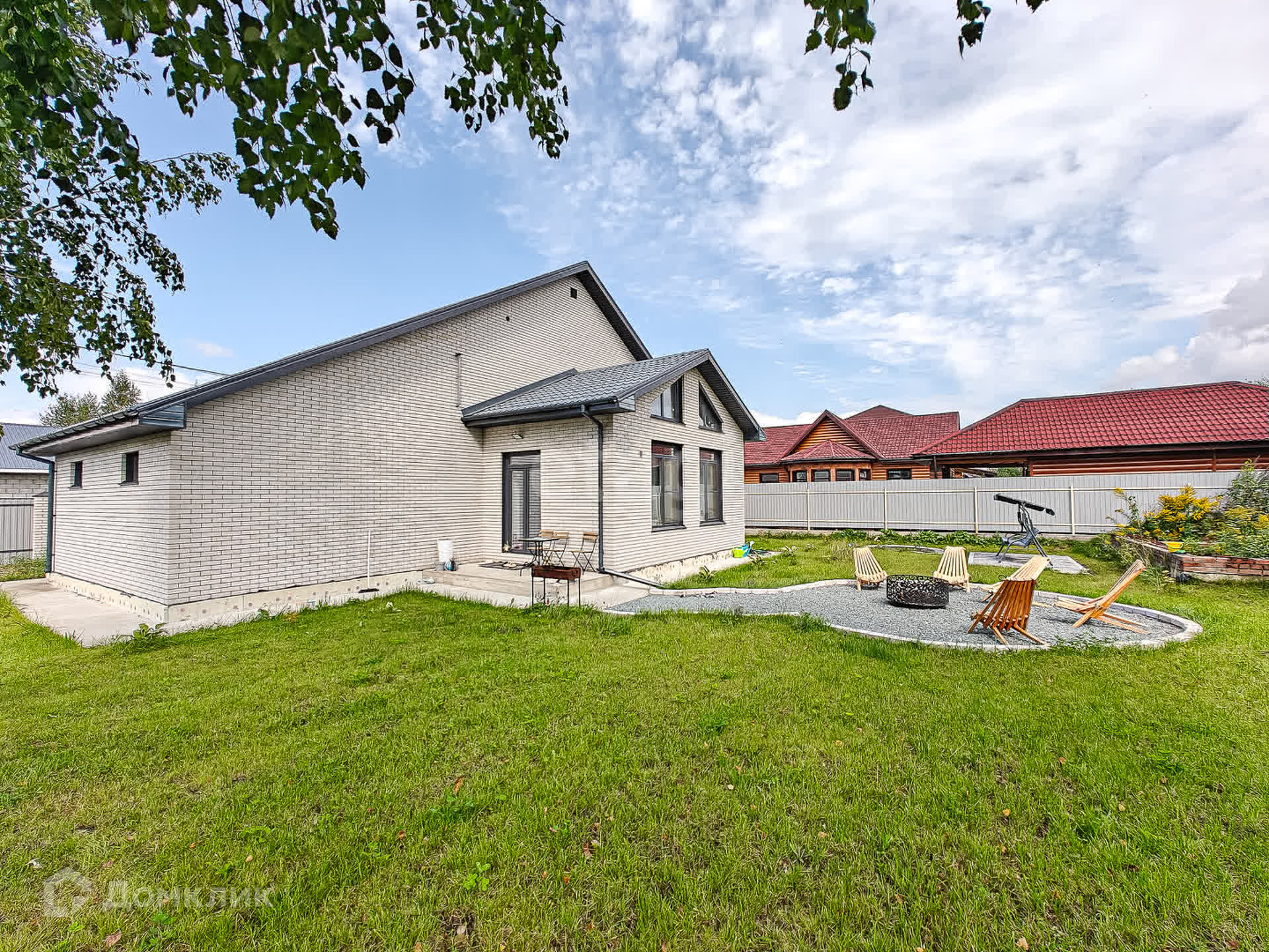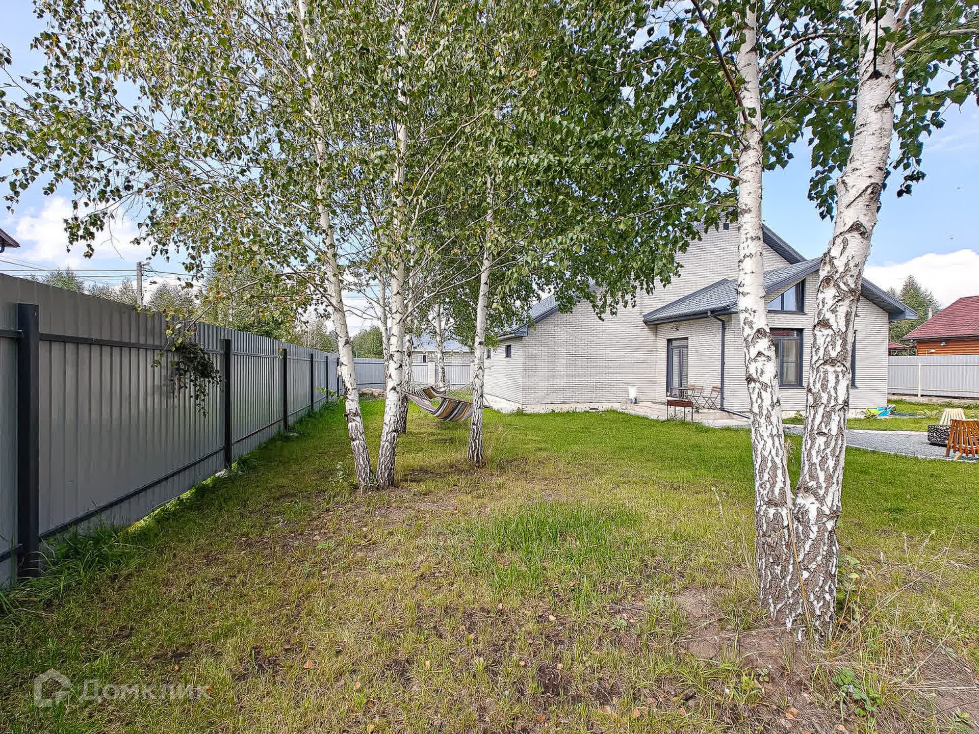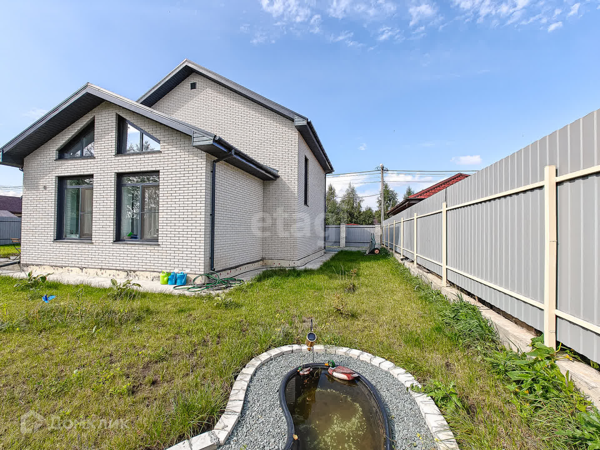 Со всех сторон участок огорожен забором. Выполнено благоустройство: газон, зона отдыха с очагом, гамаки, качеля, прудик. Участок ровный, угловой, всего 2 смежных участка.