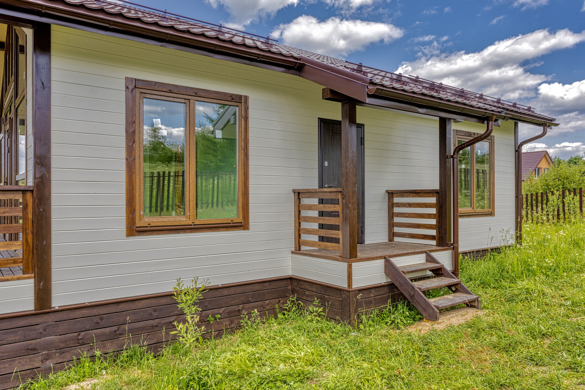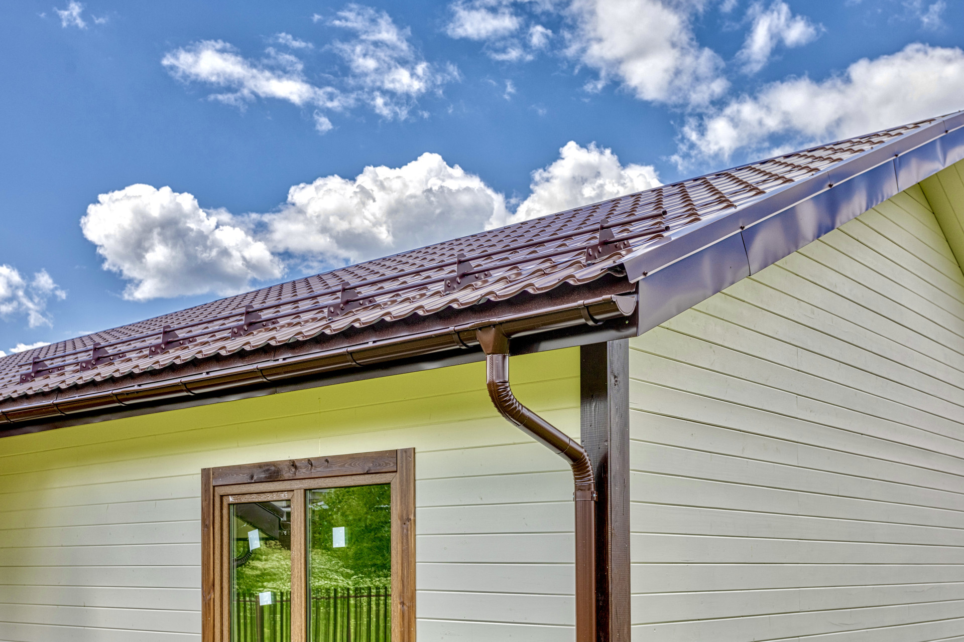 7. Металлическая сливная система дома со снегодержателями. Grand Line металлочерепица
