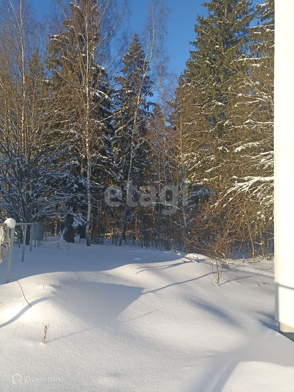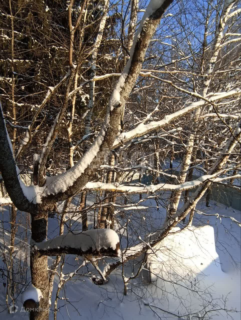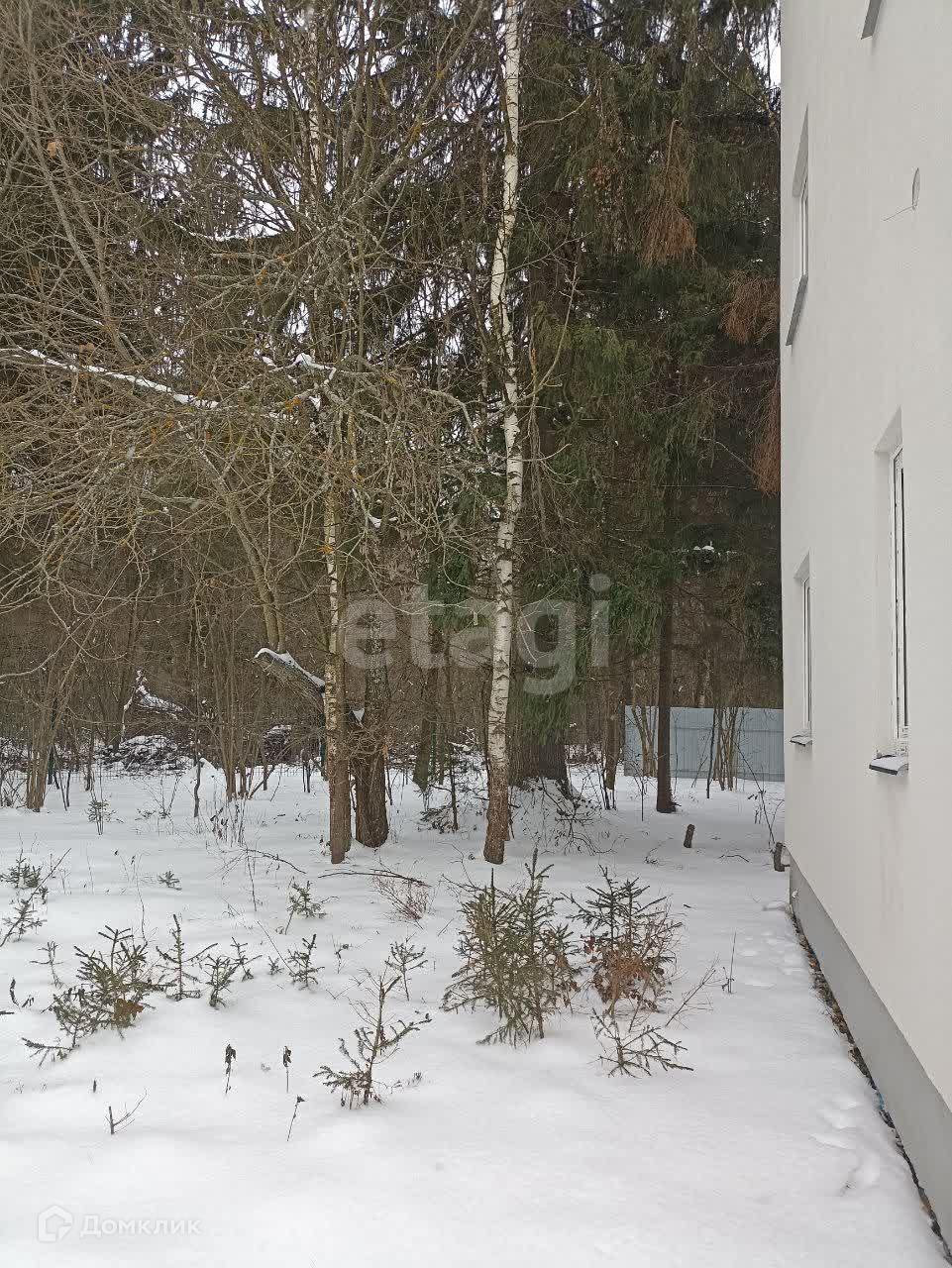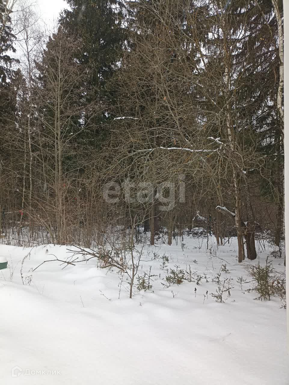 Участок 10 соток с лесными деревьями, огорожен забором из профнастила.