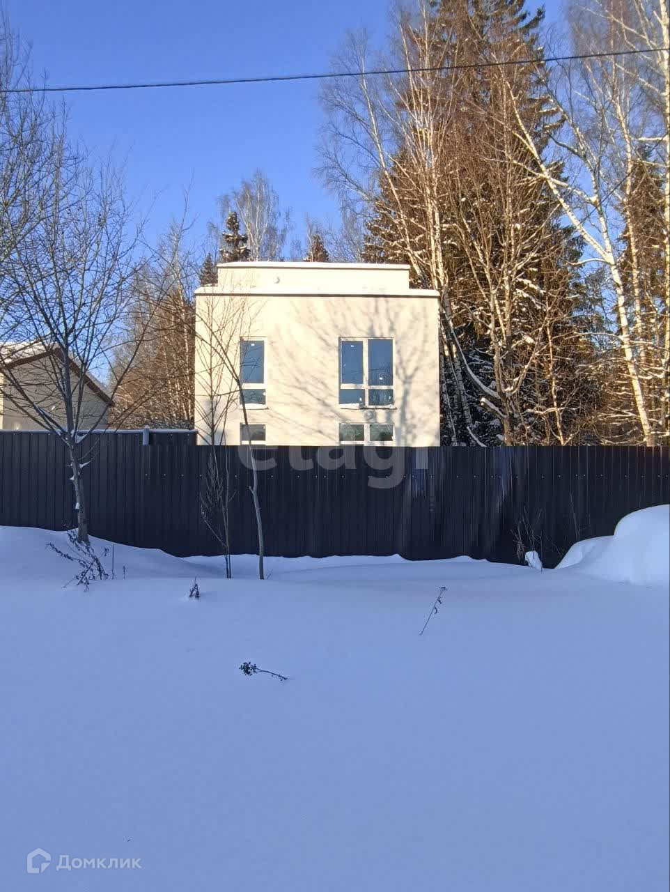 Участок 10 соток с лесными деревьями, огорожен забором из профнастила.