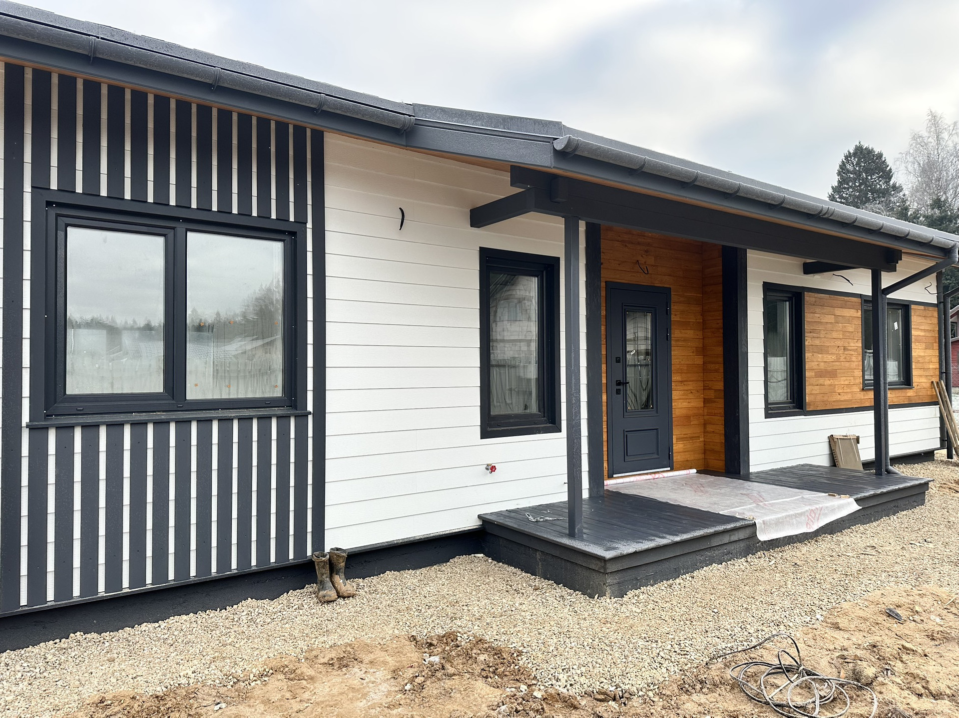 Дом каркасный, из сухого строганного дерева, построен по проекту. Фундамент - монолитная армированная плита; Крыша и фасад - вентилируемые; Вентиляция в санузлах и кухне; установлена водосточная система . Внешняя отделка дома - фиброцементный сайдинг DECOVER с декорирующими элементами из лиственницы; Декоративная подсветка дома; Утепление дома - стены - 200мм Knauf / межкомнатные - 100мм, пол - 50мм Пеноплекс, потолки - 250мм Knauf; Мембраны Grand Line; Окна - двухкамерные стеклопакеты REHAU 70 профиль с темной ламинацией; Крыша - мягкая кровля Технониколь; внутренняя отделка - полы - керамогранит / ламинат; Потолок - натяжной. На крыльце и террасе - террасная доска.