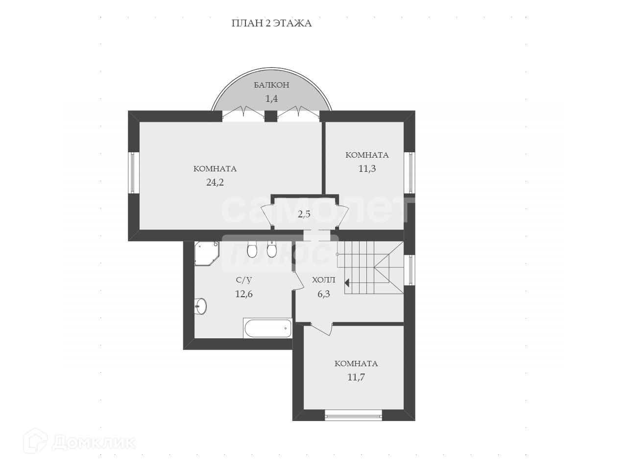 2-й этаж: просторная спальня с балконом (24.2 кв. м.), рабочий кабинет (11.3 кв. м.), спальня (11.7 кв. м.), с/у с большой ванной и душевой кабиной(12.6 кв. м.)
