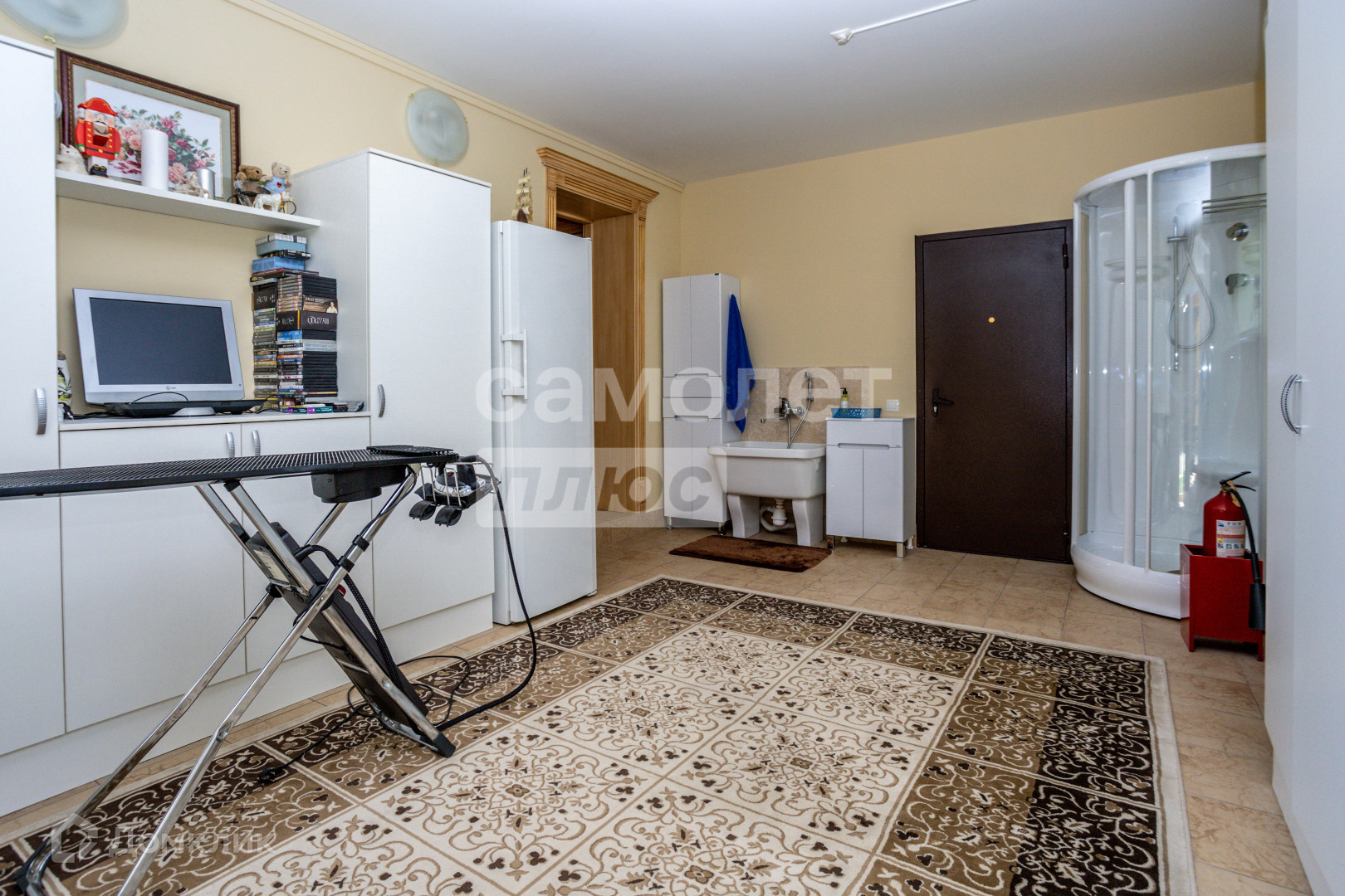 1-й этаж: просторная кухня гостиная(39.2 кв. м.) с дровяным камином и выходом на террасу, гостевая спальня (12.6 КВ. м.), гостевой с/у, подсобное помещение с раковиной для питомцев и душевой кабиной(20 кв. м ), котельная.