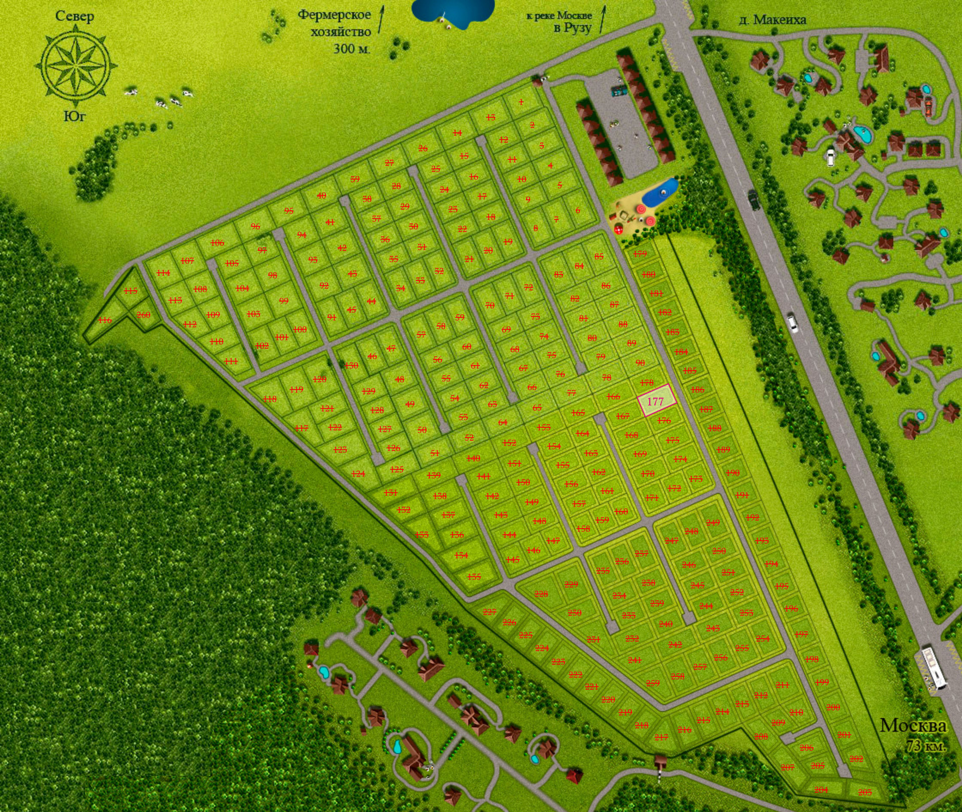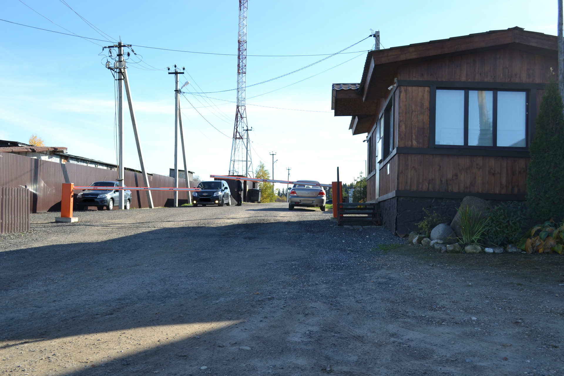 Территория поселка огорожена, охраняется. Въезд через шлагбаум по пропускам.
