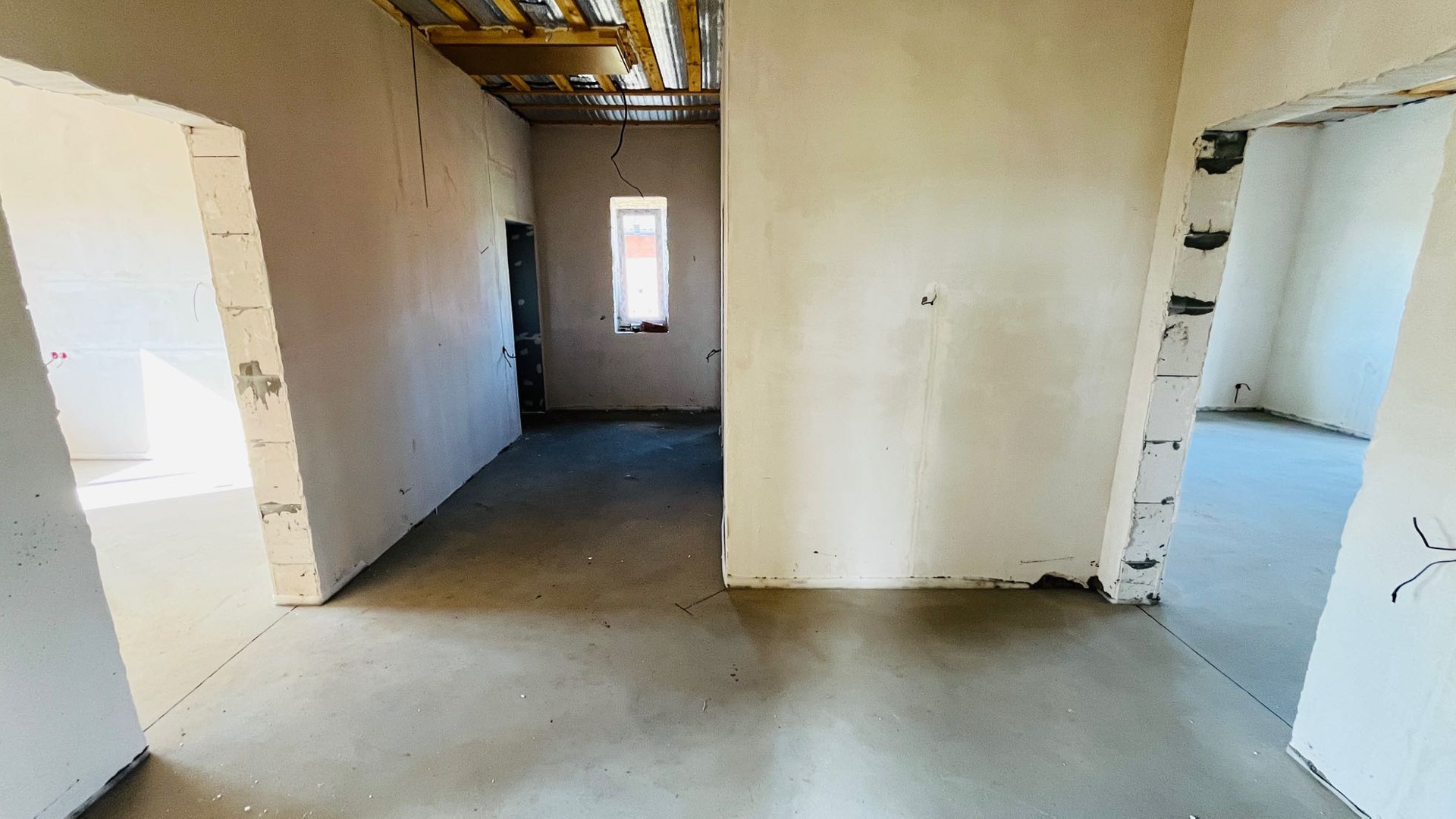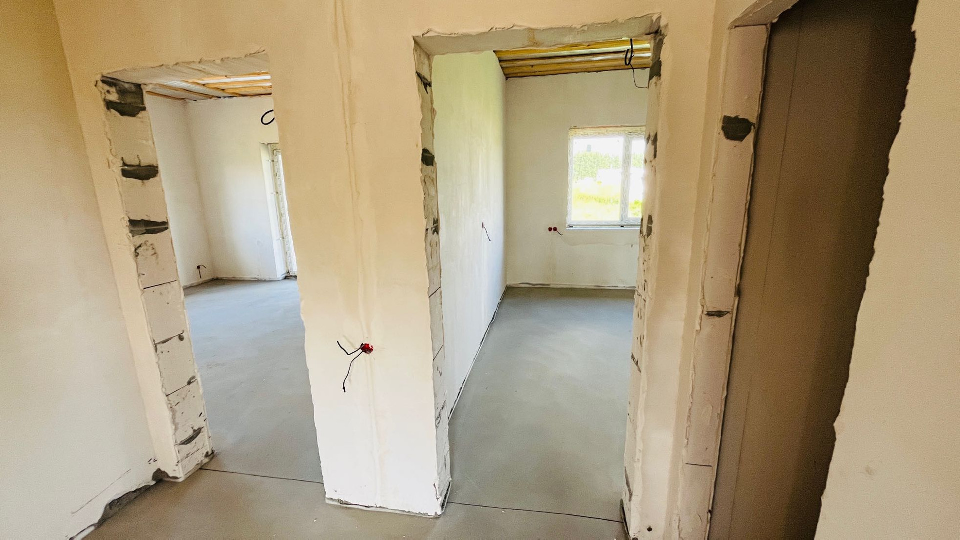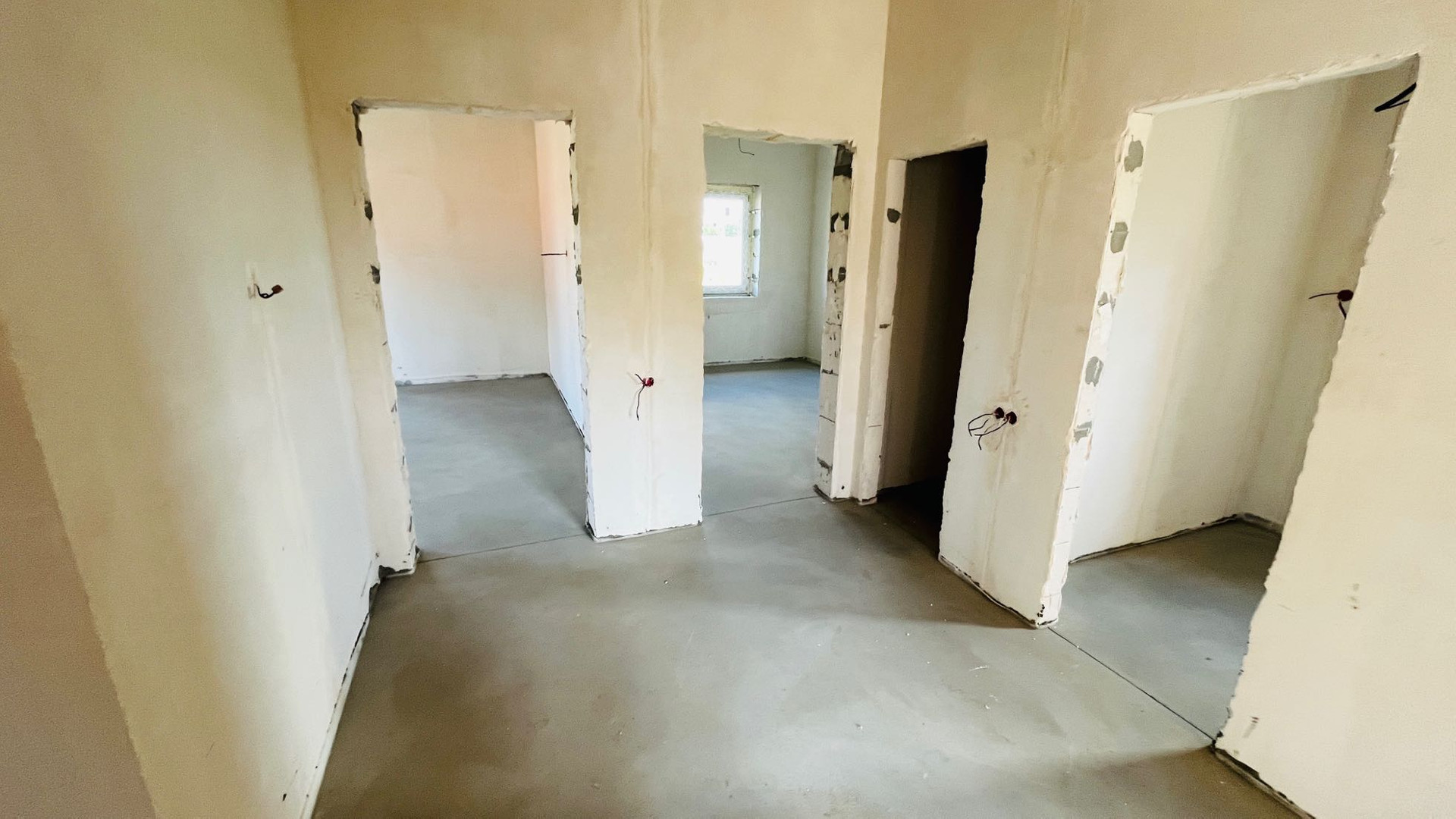 Оштукатурен, все коммуникации : разводка:  отопление теплый водяной пол, электричество розетки/выключатели, канализация.