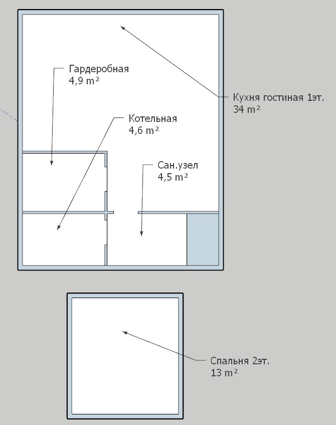 Планировка: кухня гостиная, гардеробная, сан.узел, котельная, мансардный этаж(спальня) - 61м2 и терраса 16м2.