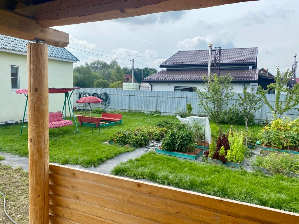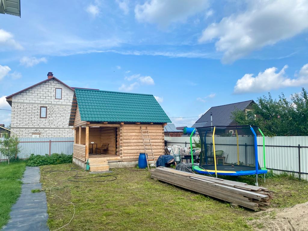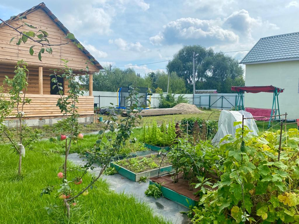 Участок правильной прямоугольной формы огорожен профлистом. Ровный, ухоженный. Огородик, молодые плодовые деревья и кустарники, все плодоносит. Недавно поставили новый сруб для бани.